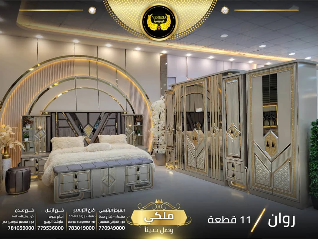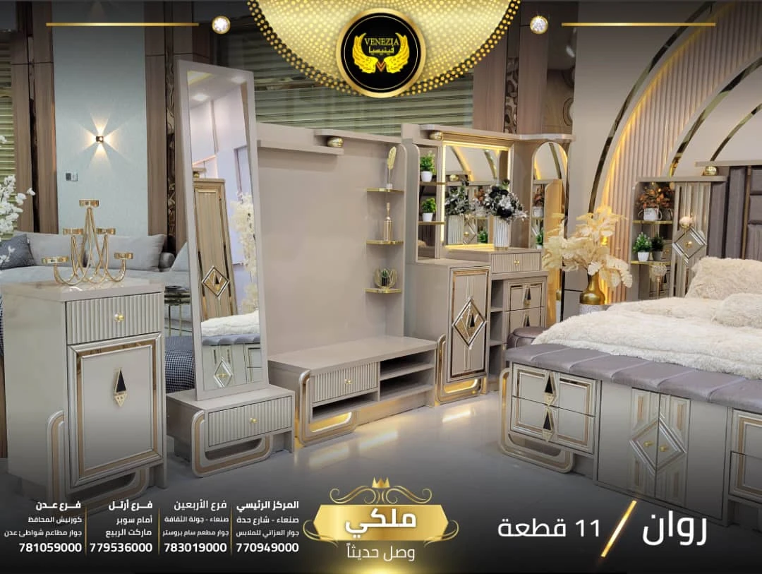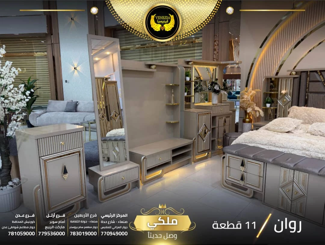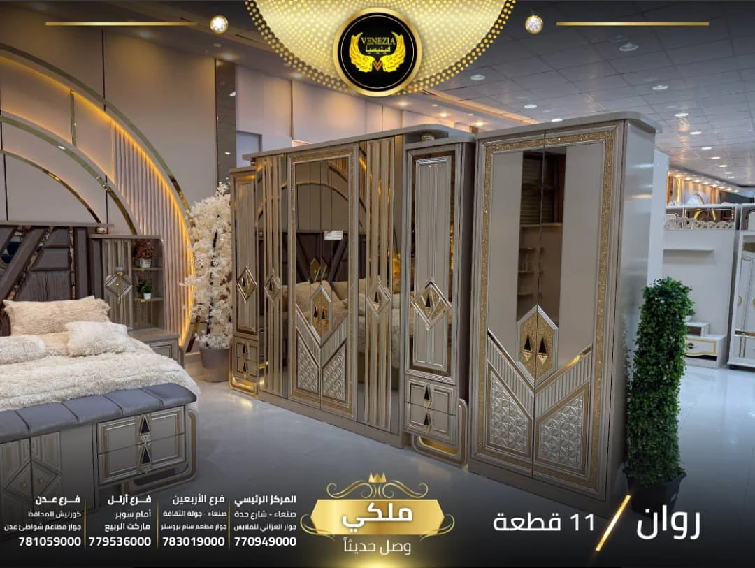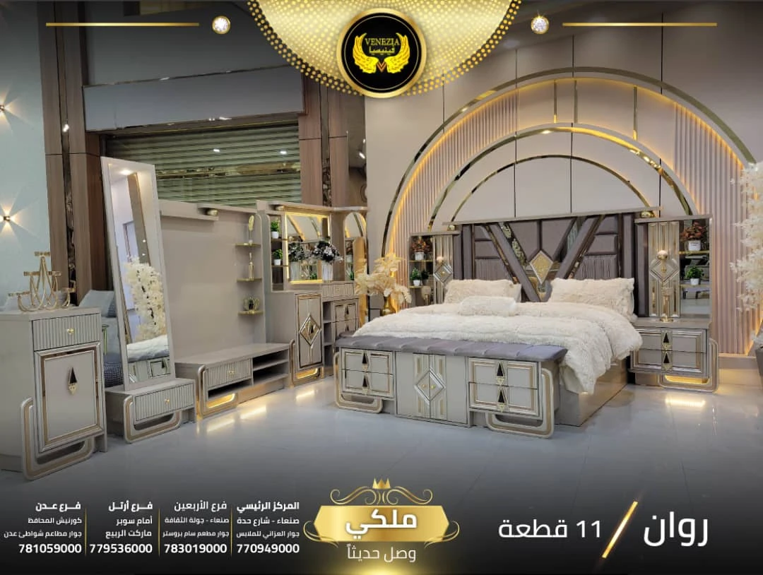 (يمكن إضافة تفاصيل القطع الـ 11 إذا رغبت: سرير – دولاب – تسريحة – مرايات – كومدينو…)