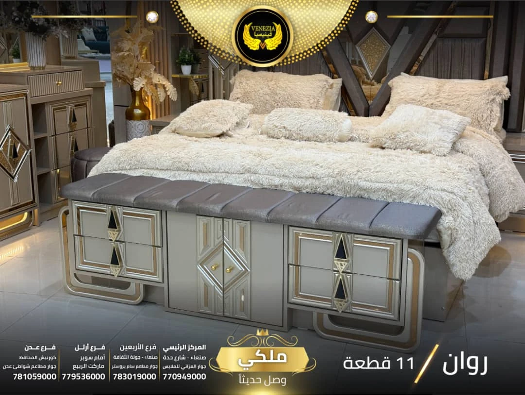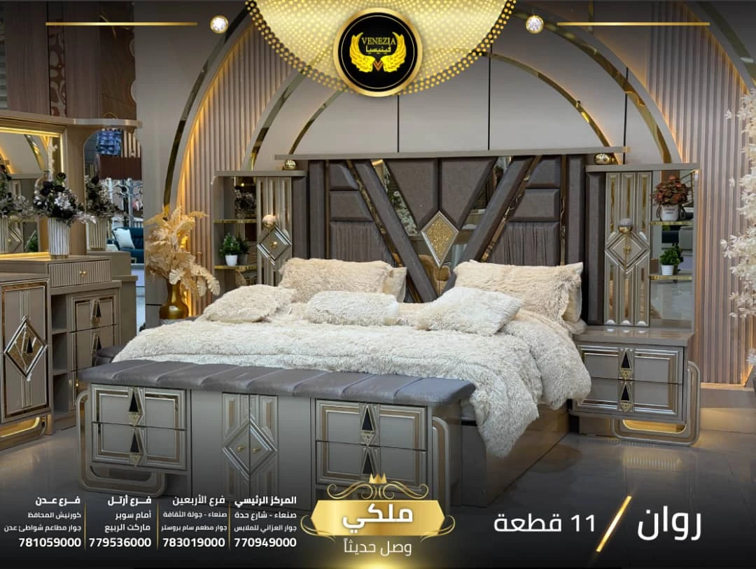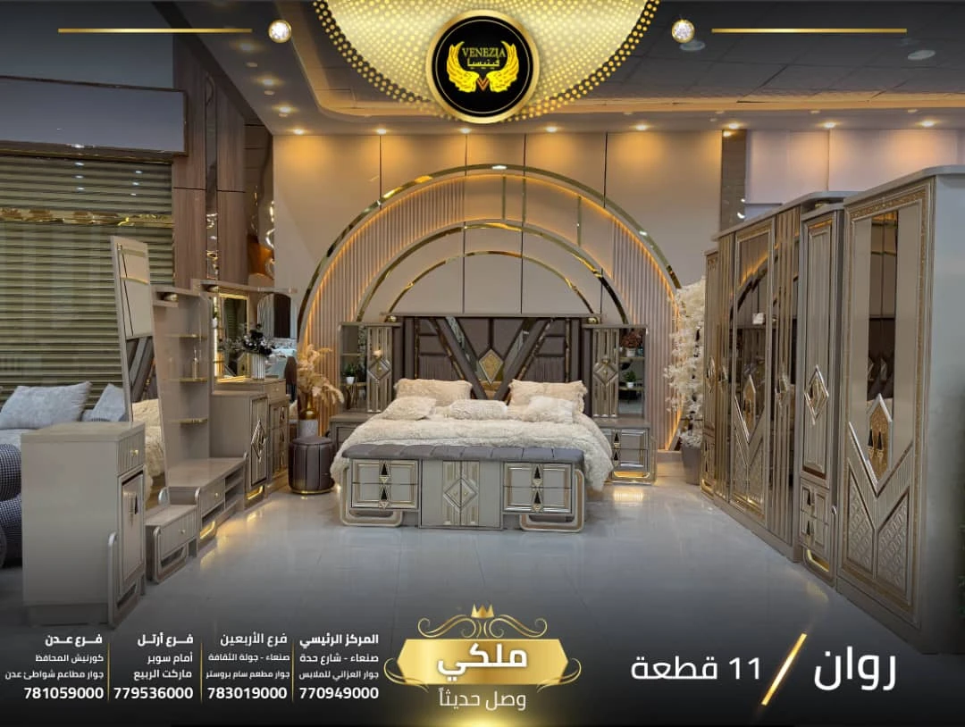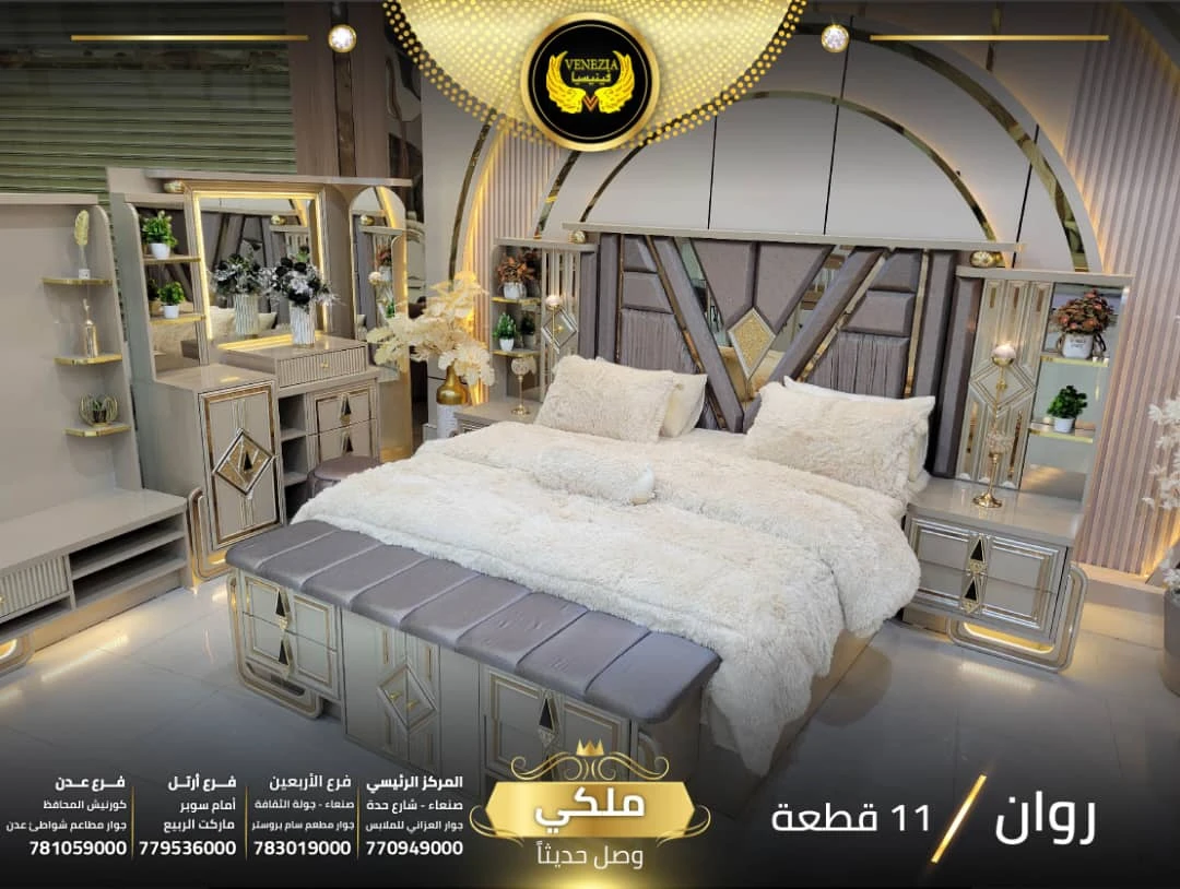 (يمكن إضافة تفاصيل القطع الـ 11 إذا رغبت: سرير – دولاب – تسريحة – مرايات – كومدينو…)