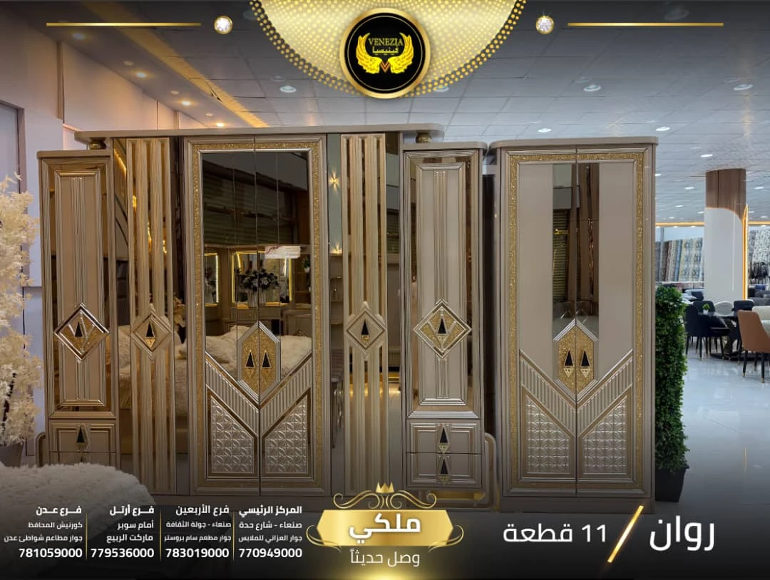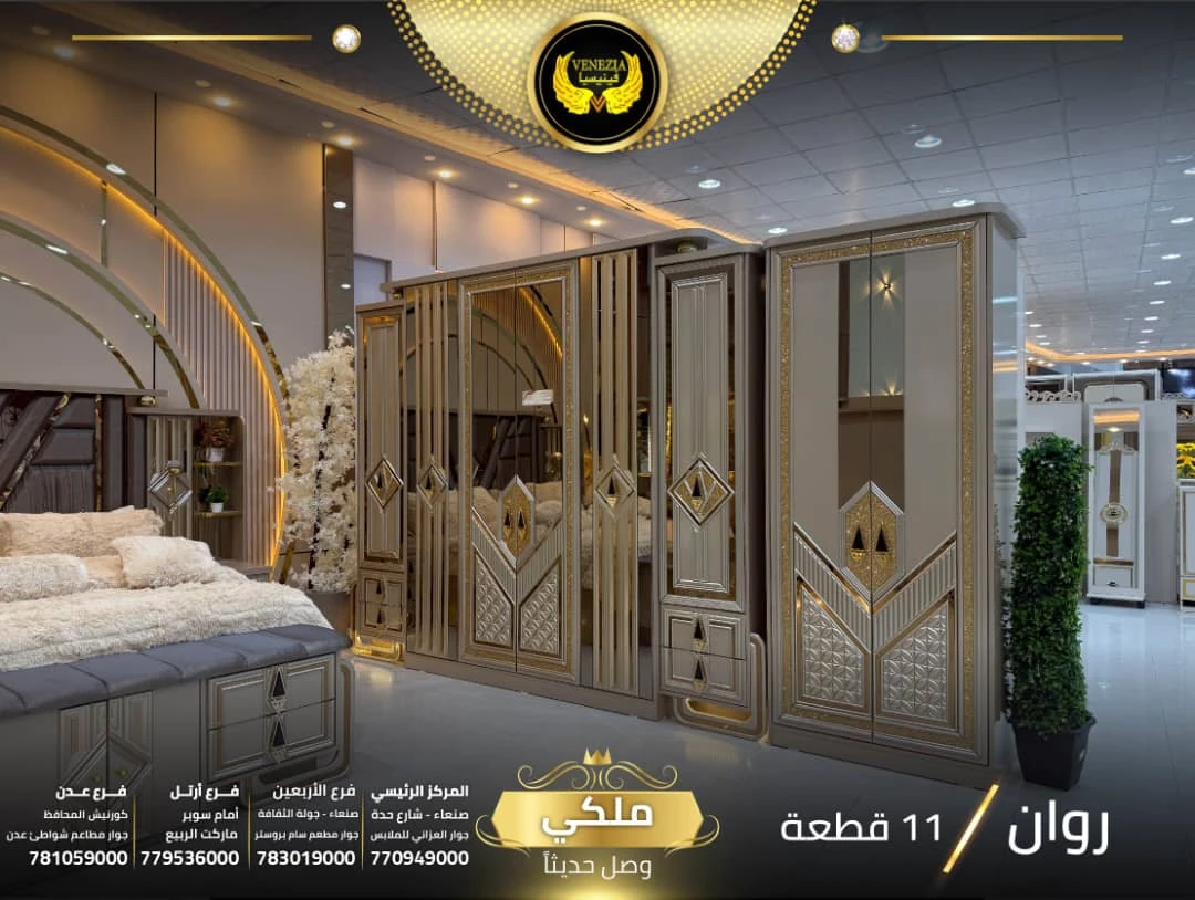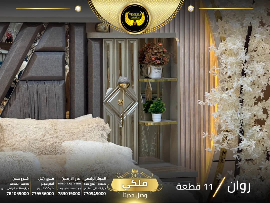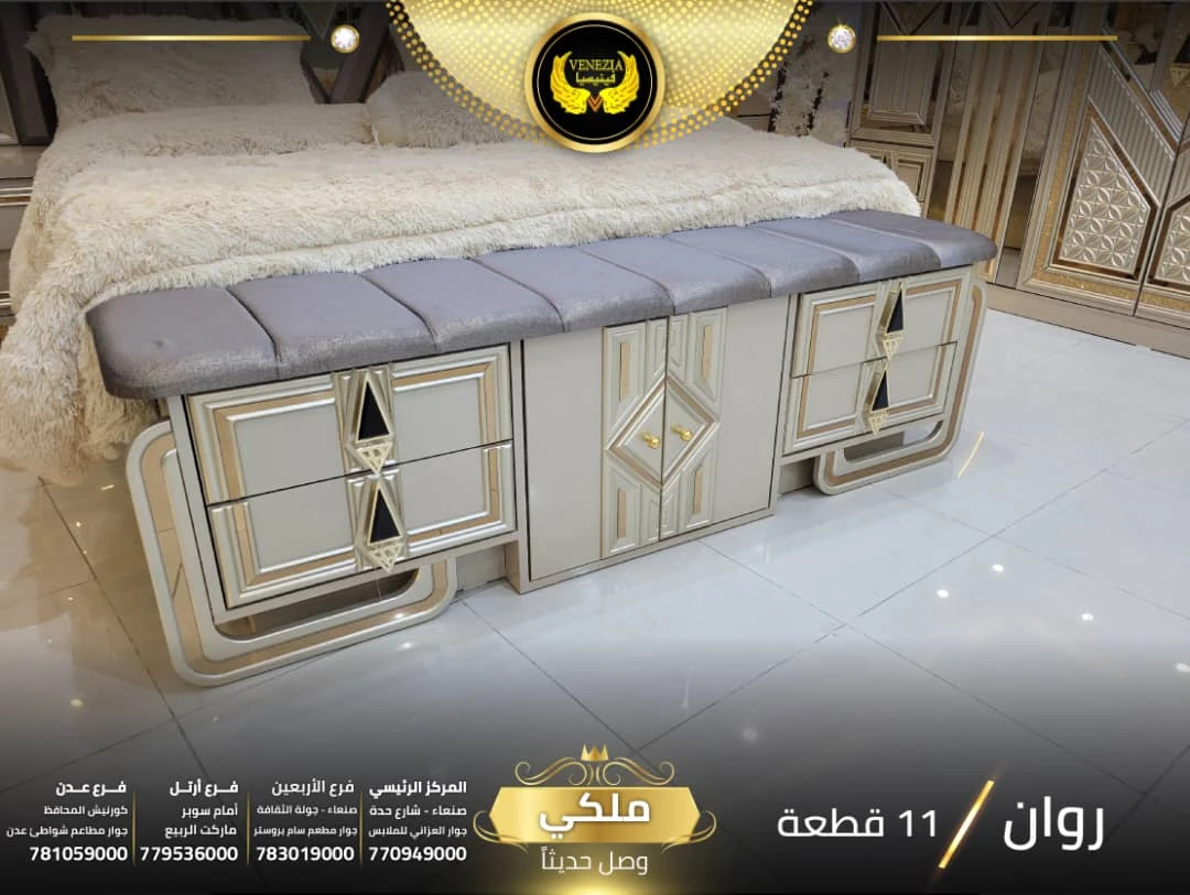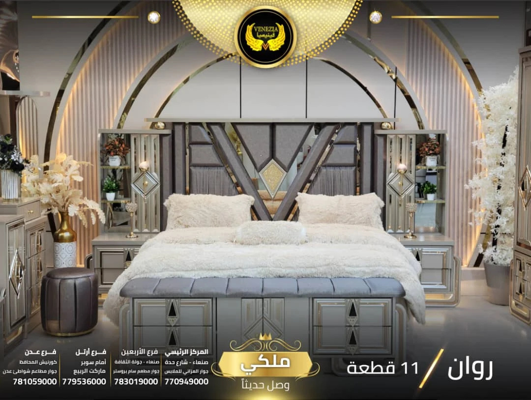 (يمكن إضافة تفاصيل القطع الـ 11 إذا رغبت: سرير – دولاب – تسريحة – مرايات – كومدينو…)