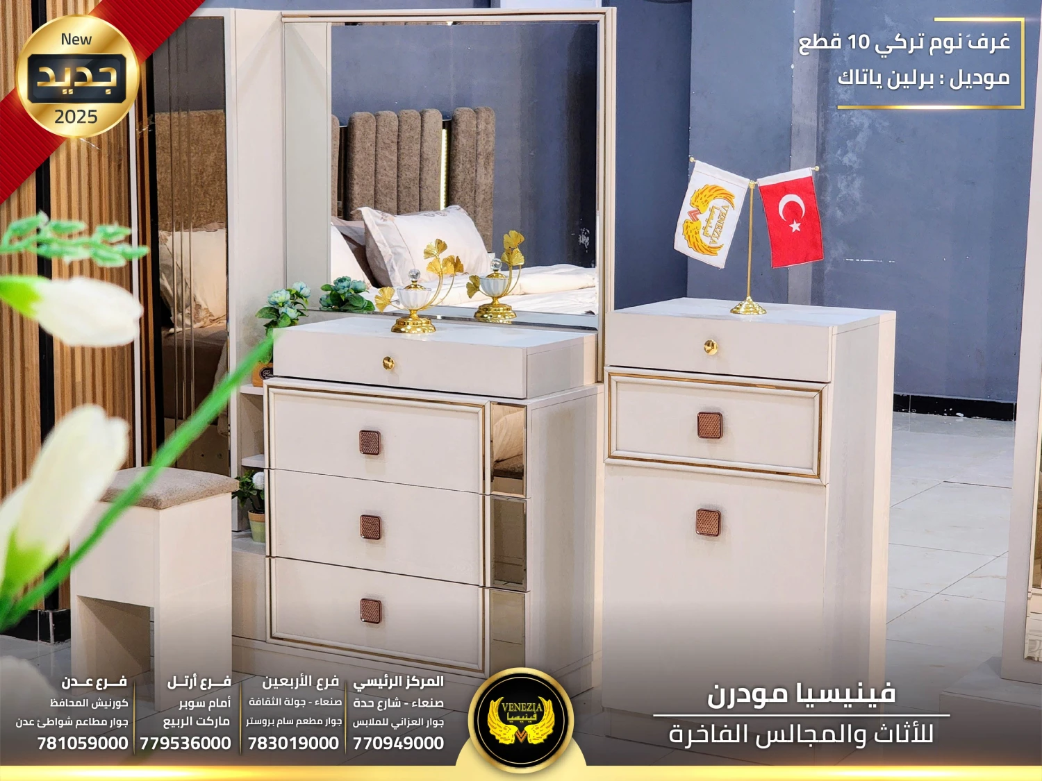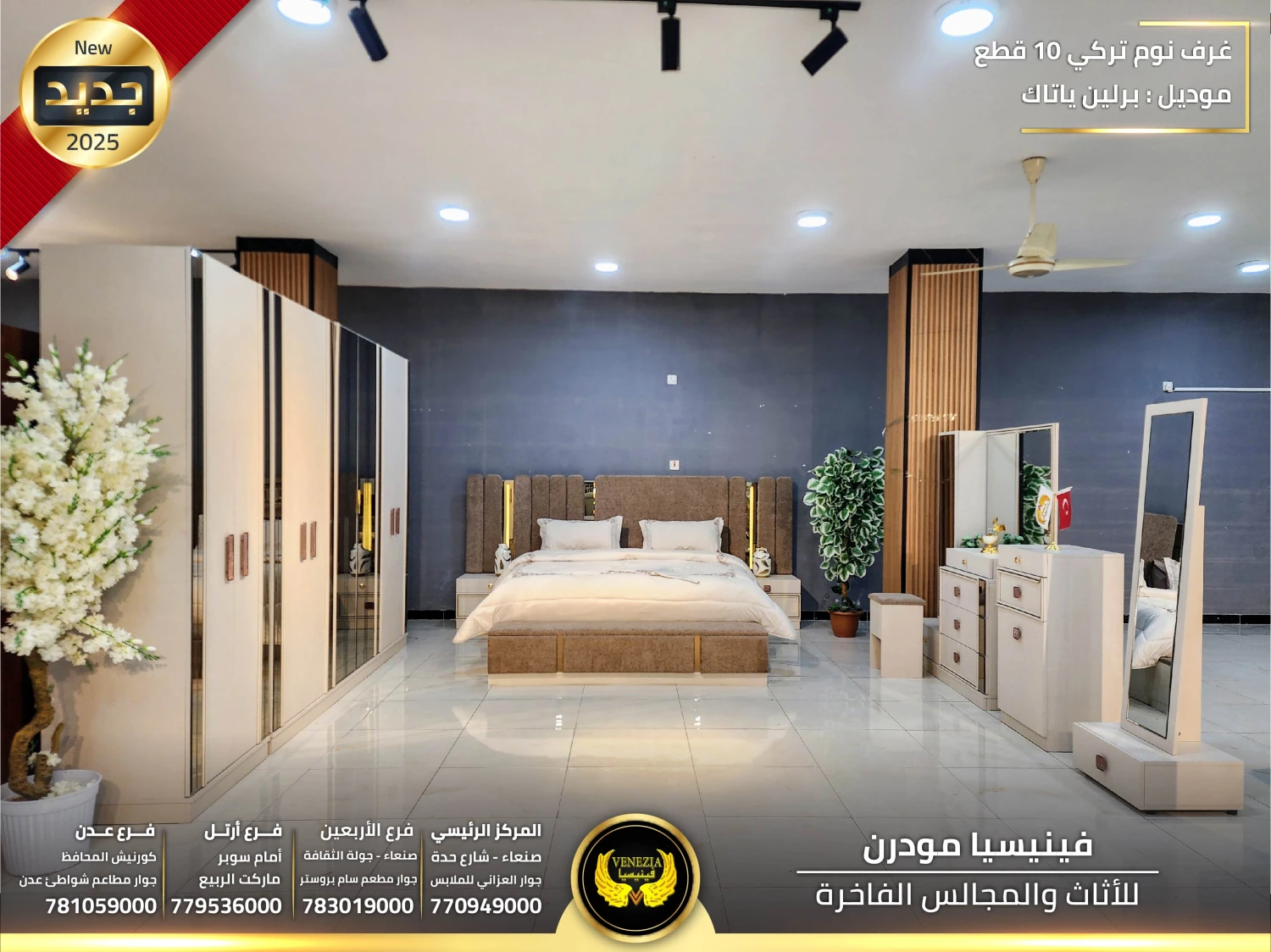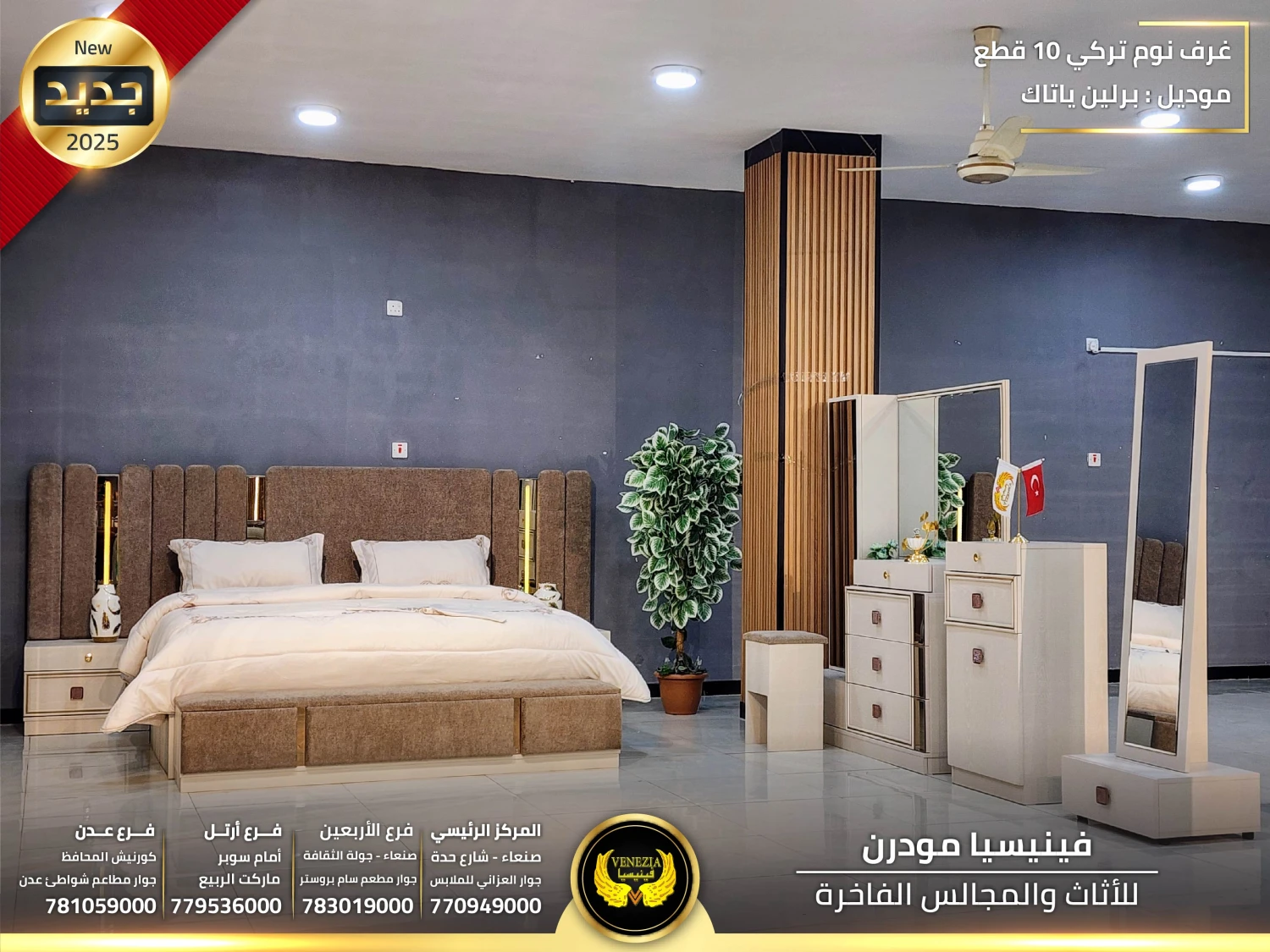 غرفة نوم فاخرة 10 قطع صناعة تركية بتصميم عصري يضيف لمنزلك لمسة راقية تجمع بين الجودة العالية والمتانة والأناقة. تأتي هذه الغرفة بخامات ممتازة مقاومة للاستخدام اليومي، وتناسب أجواء المنازل في اليمن بمختلف المحافظات مثل صنعاء، عدن، تعز، إب، الحديدة، المكلا، مأرب وغيرها.