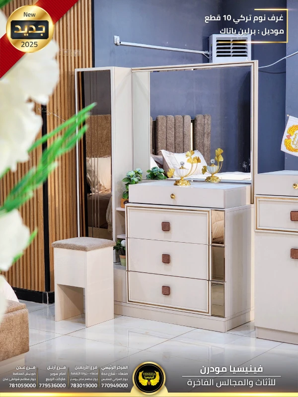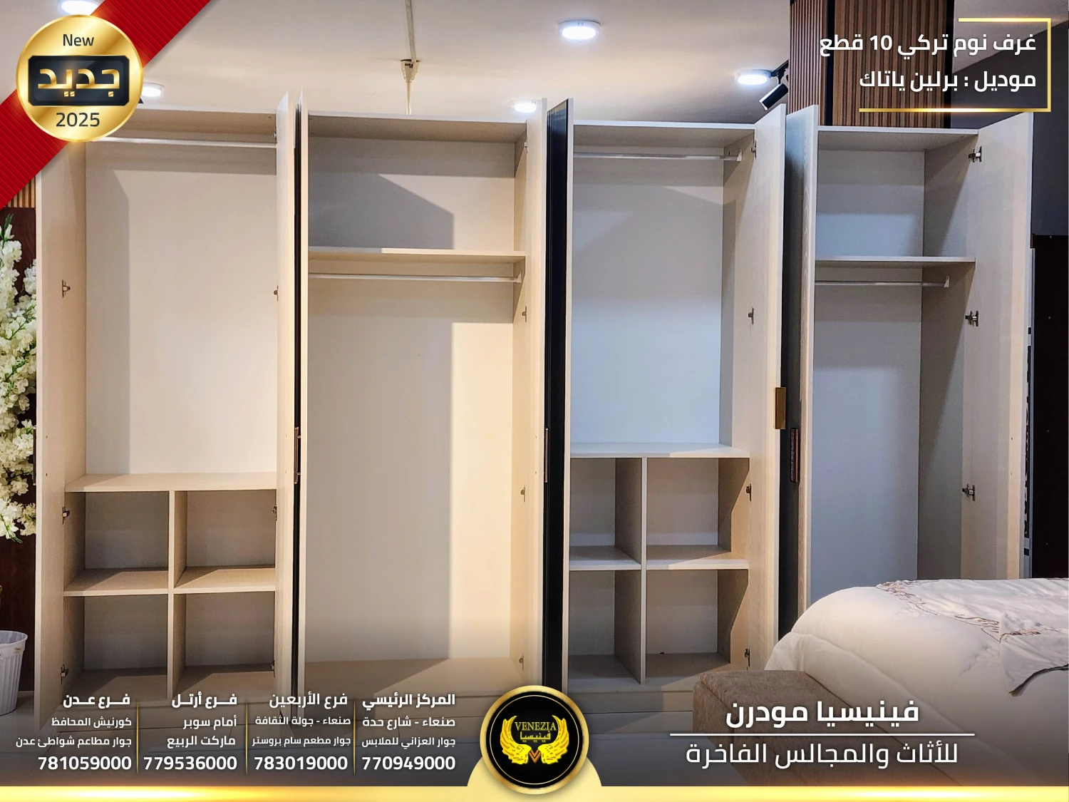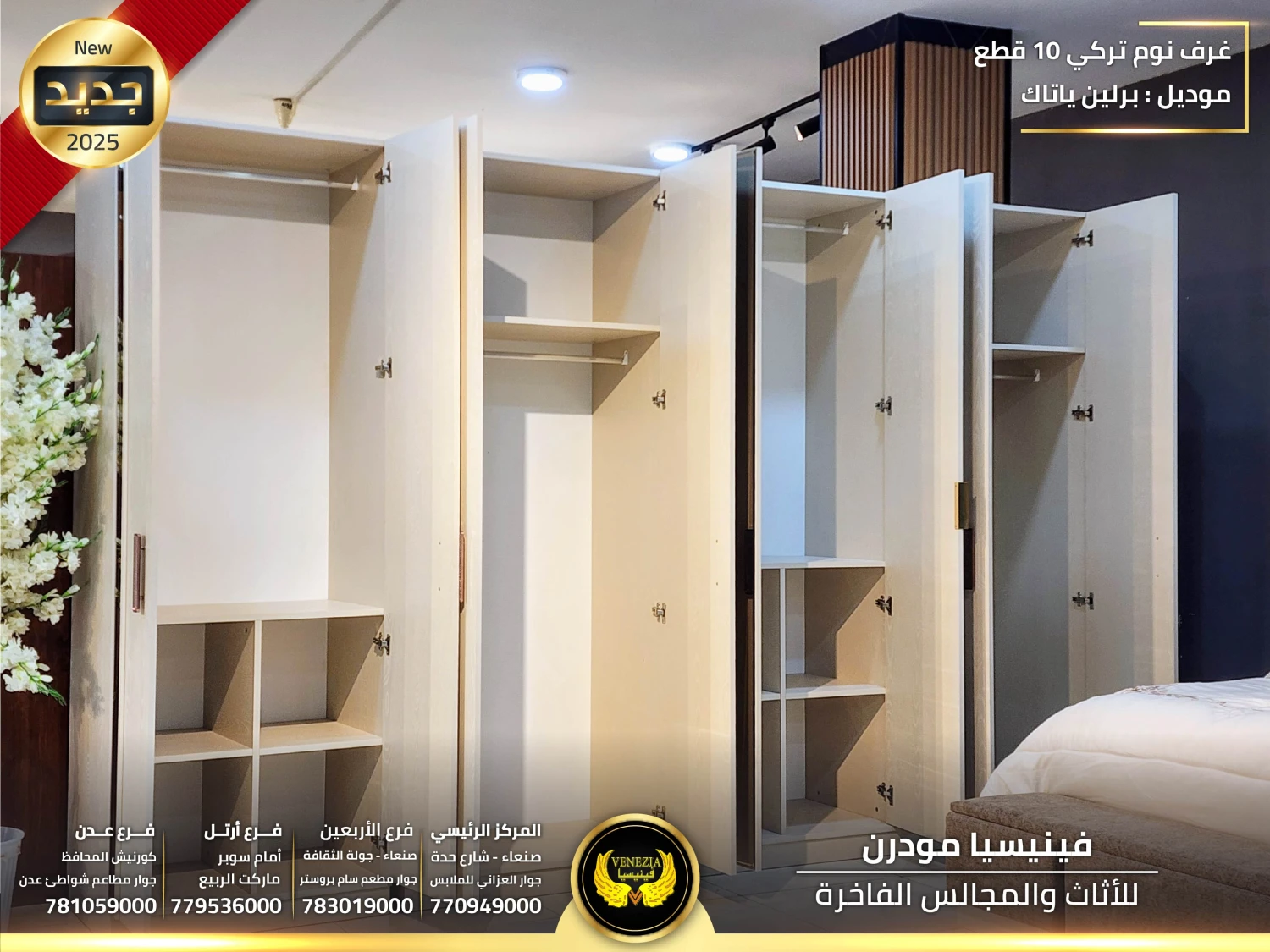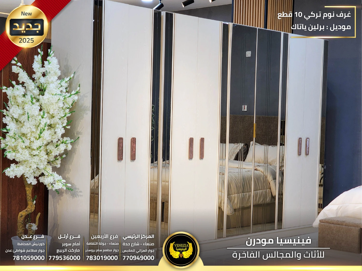 غرفة نوم فاخرة 10 قطع صناعة تركية بتصميم عصري يضيف لمنزلك لمسة راقية تجمع بين الجودة العالية والمتانة والأناقة. تأتي هذه الغرفة بخامات ممتازة مقاومة للاستخدام اليومي، وتناسب أجواء المنازل في اليمن بمختلف المحافظات مثل صنعاء، عدن، تعز، إب، الحديدة، المكلا، مأرب وغيرها.