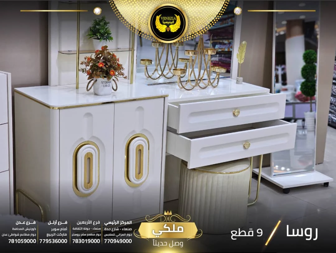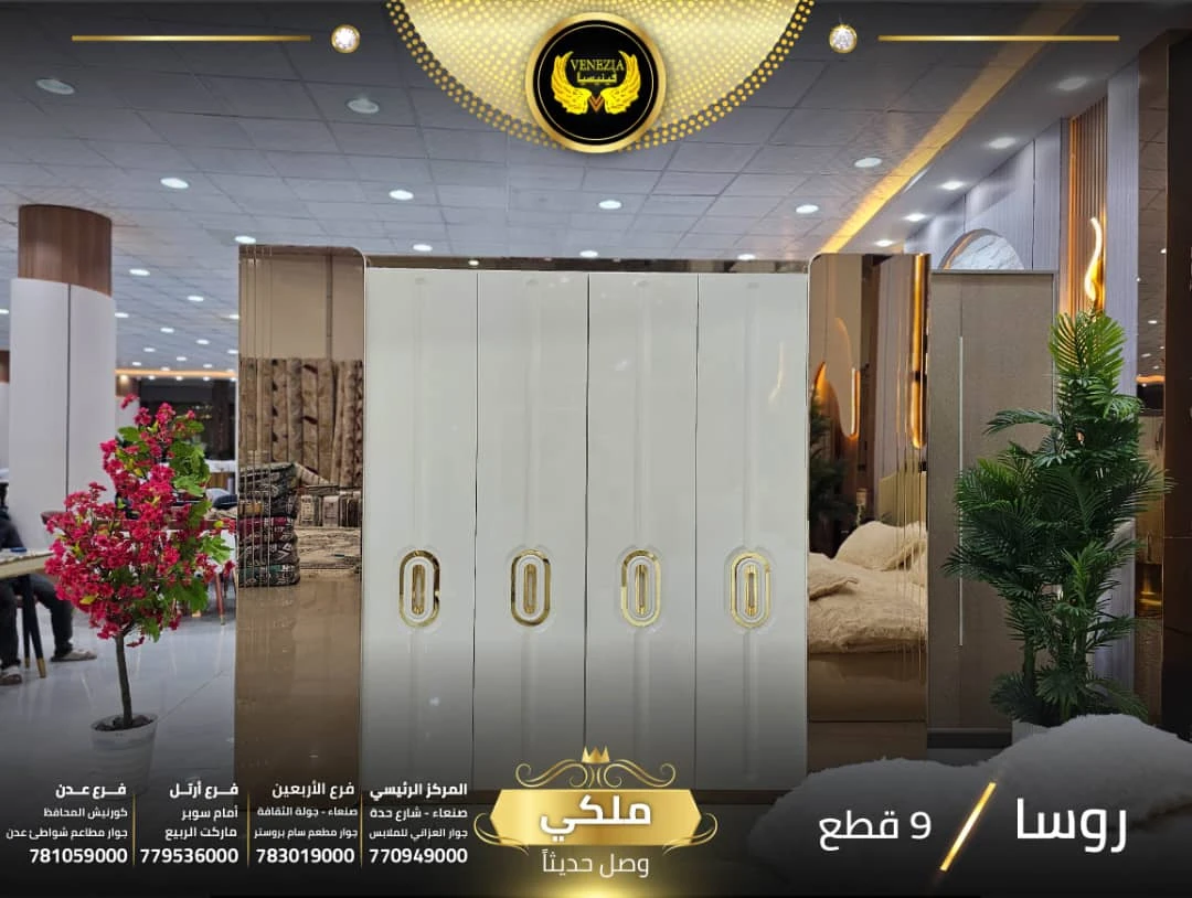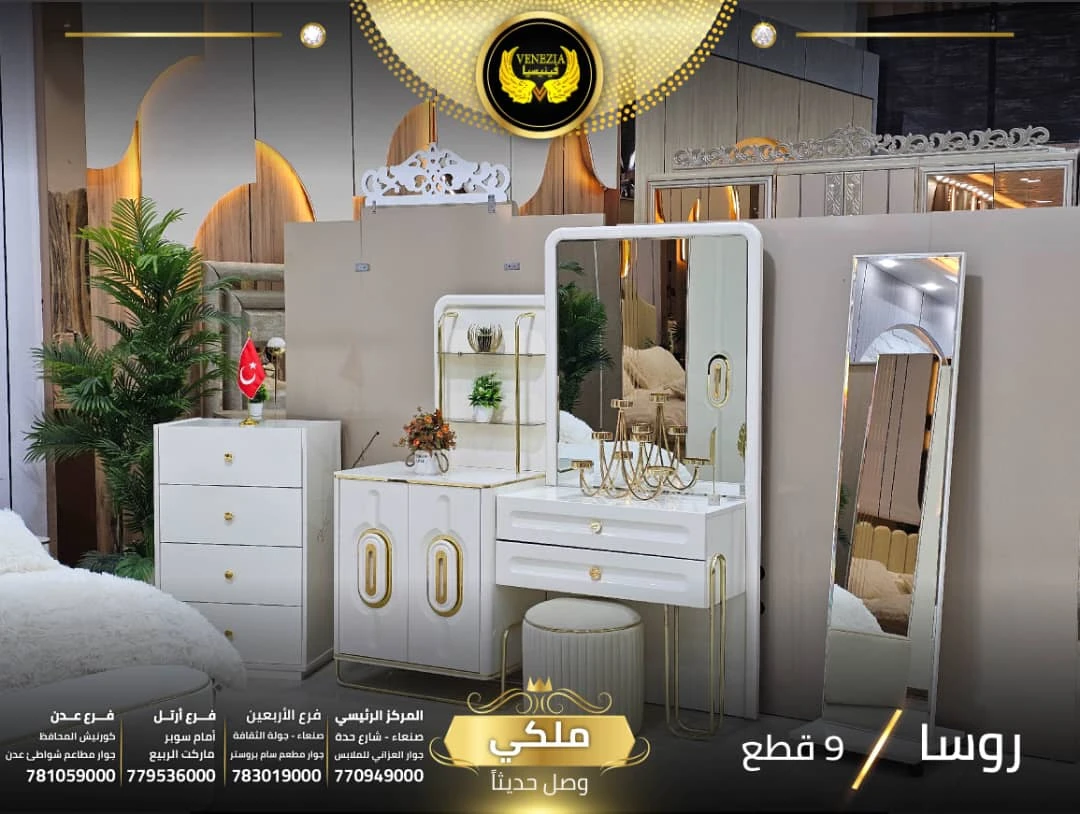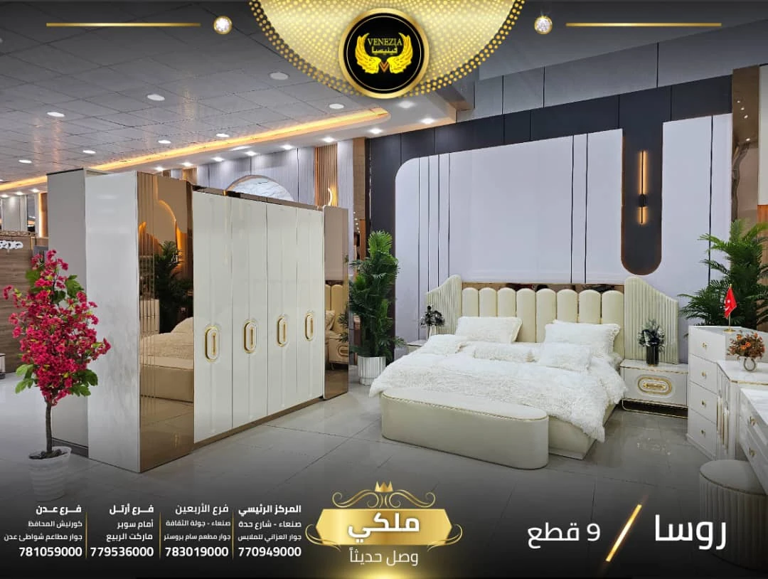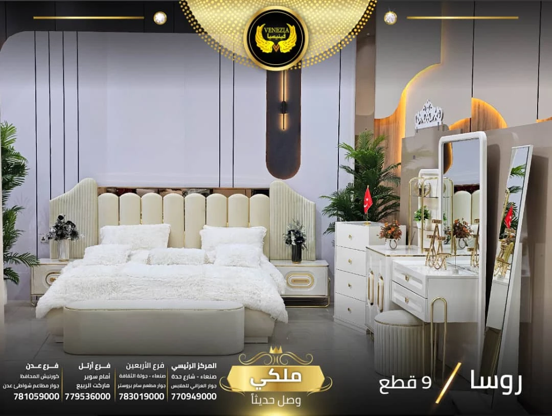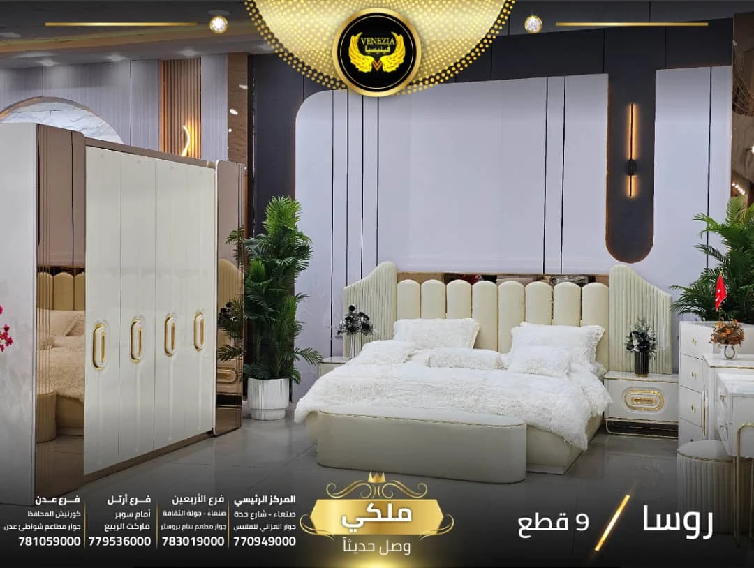 امنح غرفتك لمسة فخامة راقية مع غرفة نوم تركي 9 قطع – موديل روسا من شركة فينيسيا مودرن.