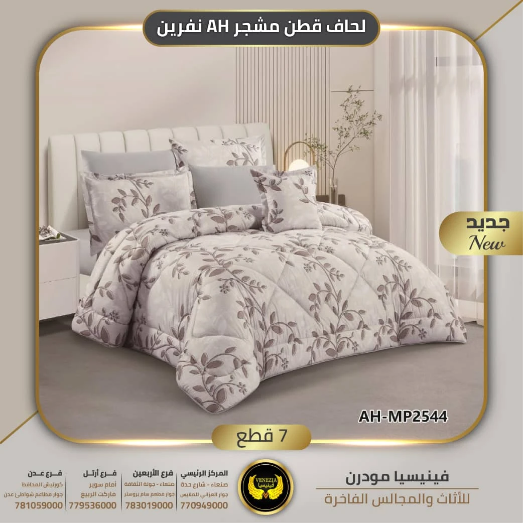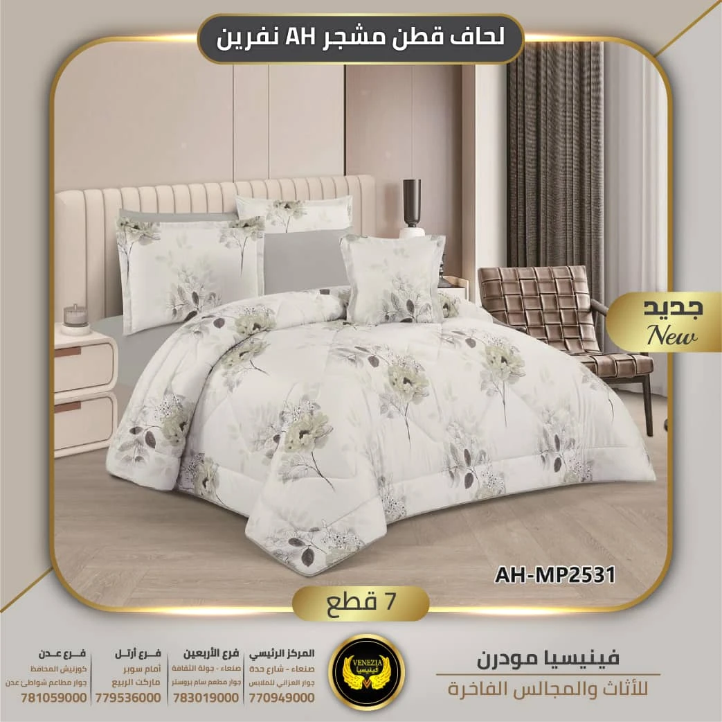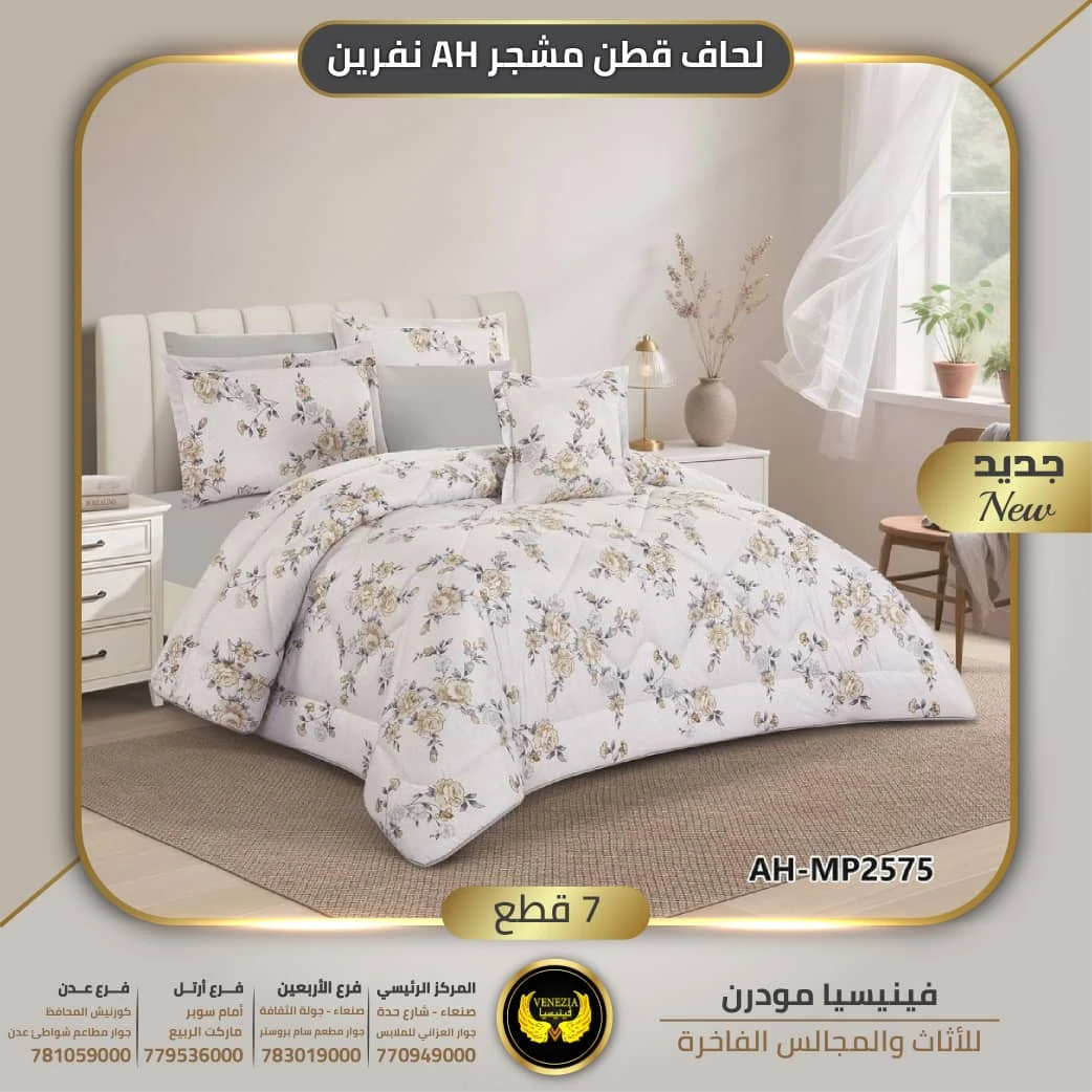 أضيفي جمالًا وأناقة لغرفة نومك مع لحافات قطن مشجر AH – طقم 7 قطع المتوفرة لدى فينيسيا مودرن.