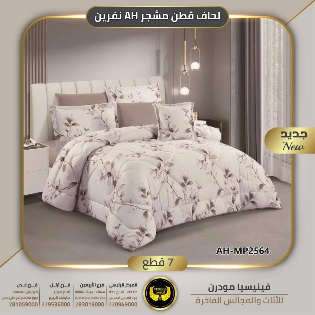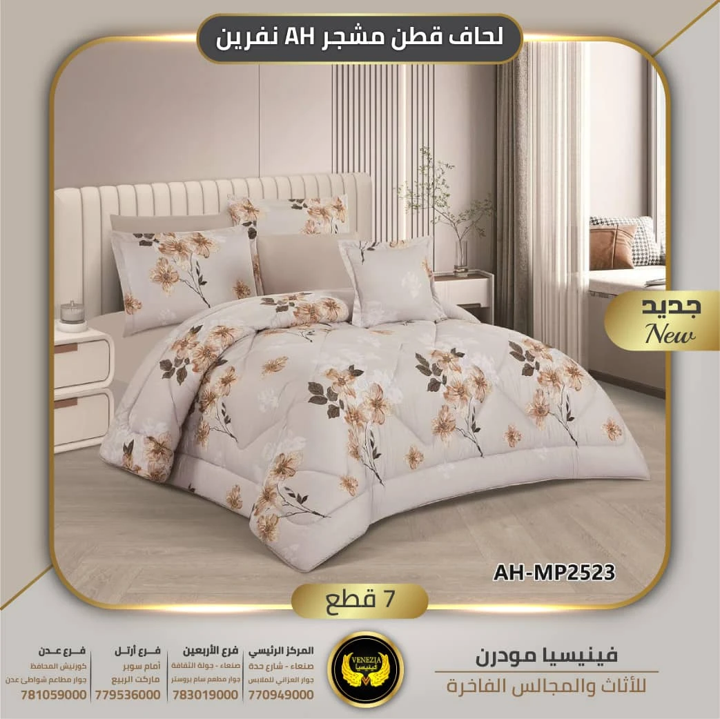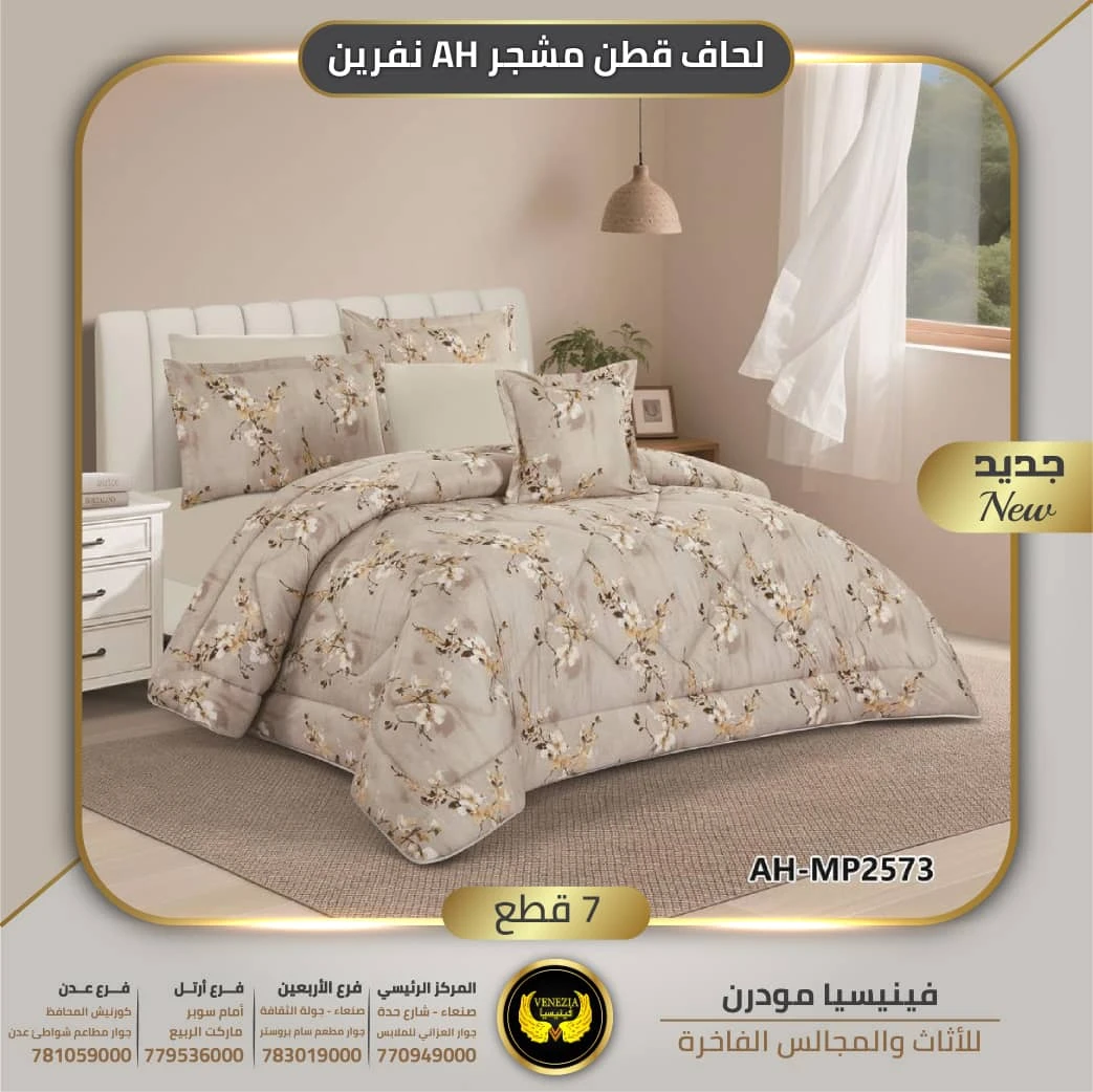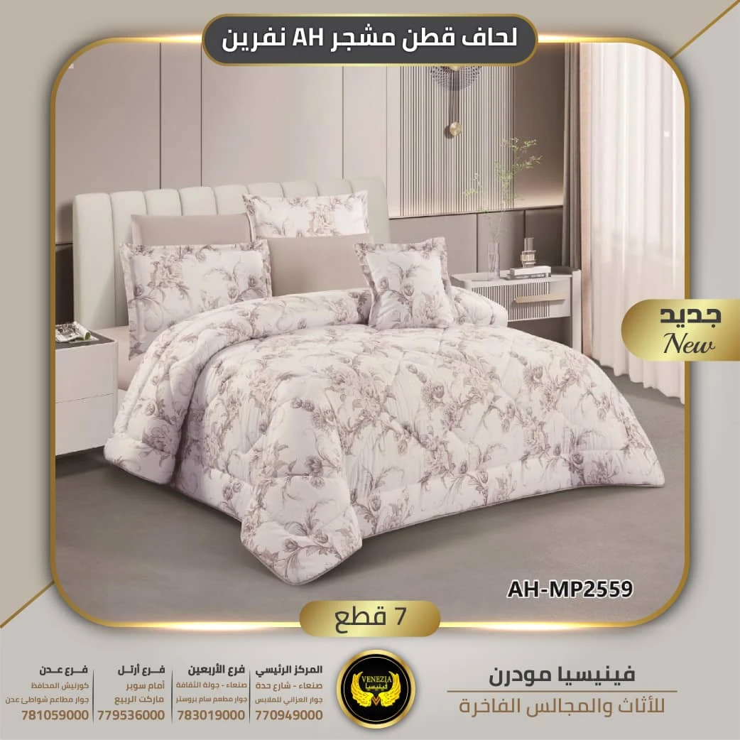 أضيفي جمالًا وأناقة لغرفة نومك مع لحافات قطن مشجر AH – طقم 7 قطع المتوفرة لدى فينيسيا مودرن.