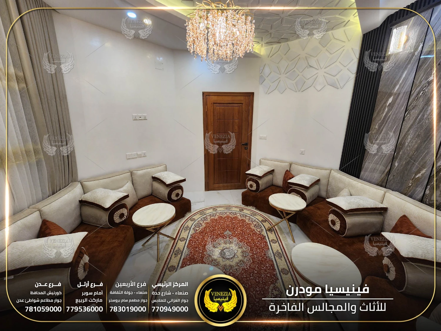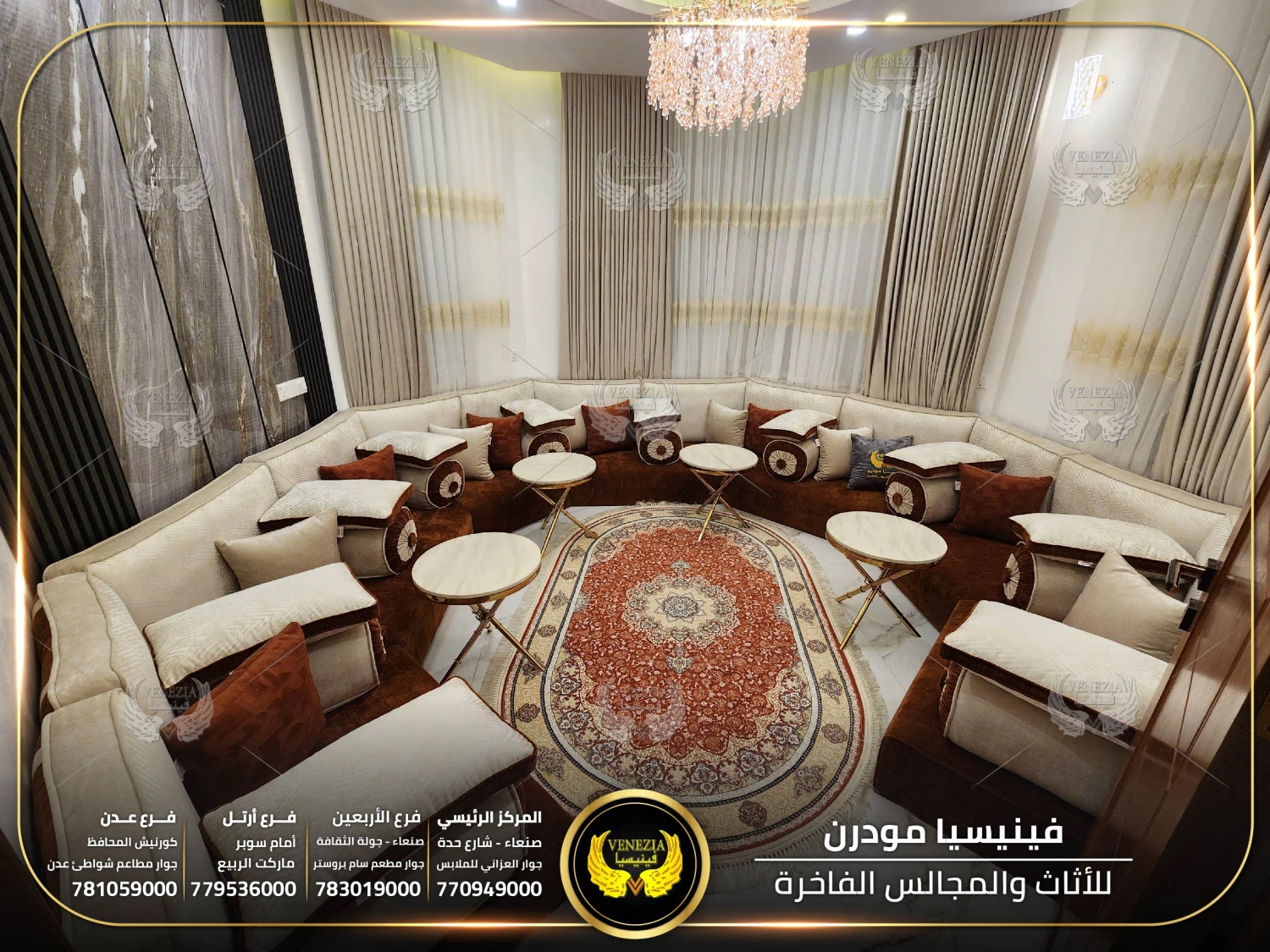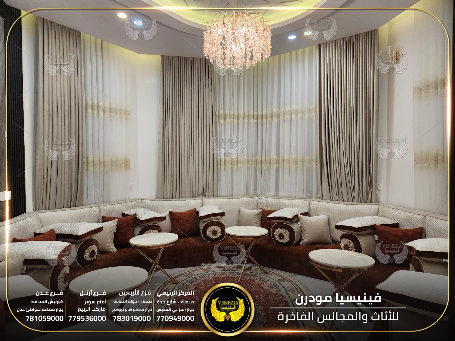 مجالس عربية من فينيسيا مودرن تجمع بين الفخامة والجودة العالية، مصنوعة من أفضل المواد وبأحدث التصاميم التي تناسب الذوق اليمني. نوفر مجالس جاهزة ومجالس تفصيل حسب الطلب مع إمكانية اختيار الألوان والأقمشة. نوفر شحنًا سريعًا داخل اليمن وخدمة تركيب احترافية.
