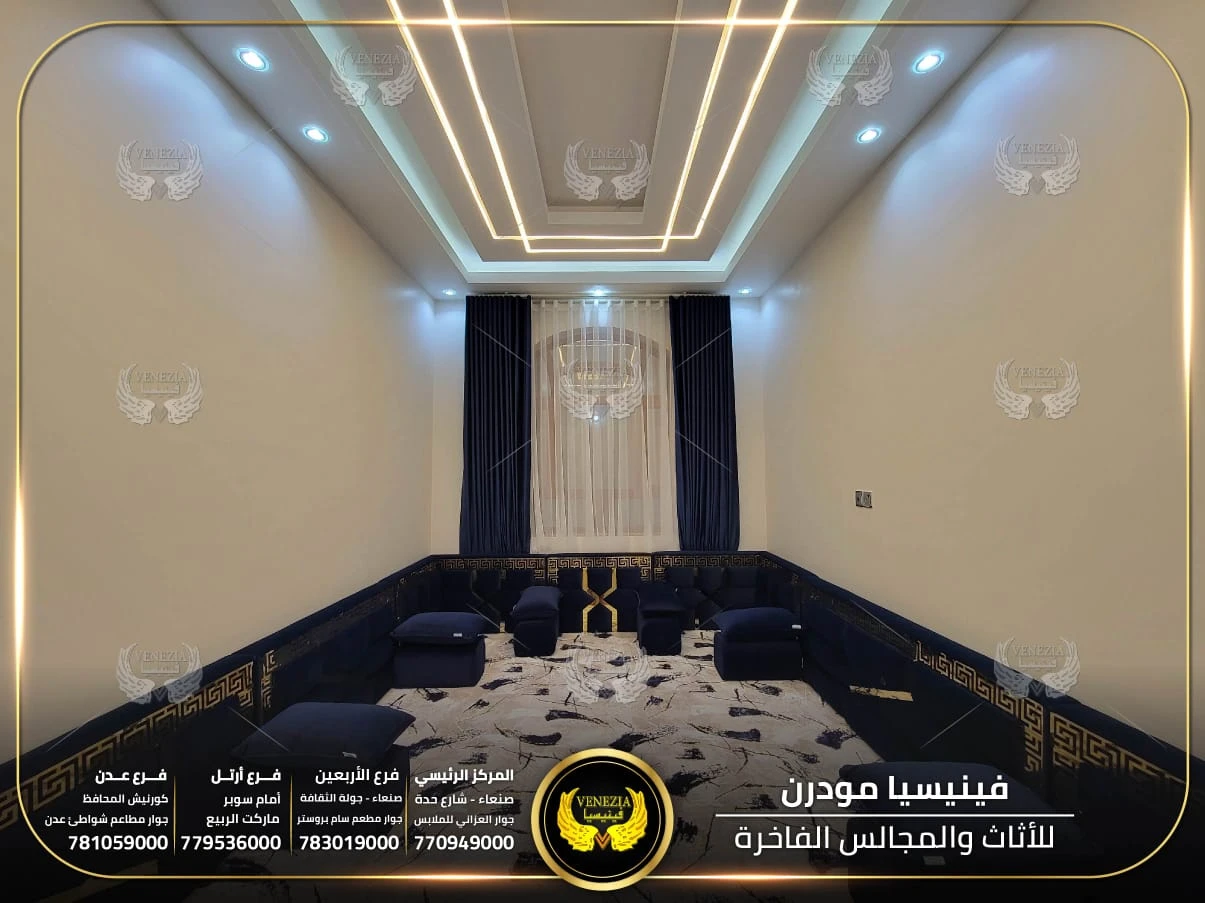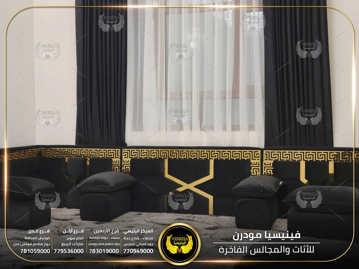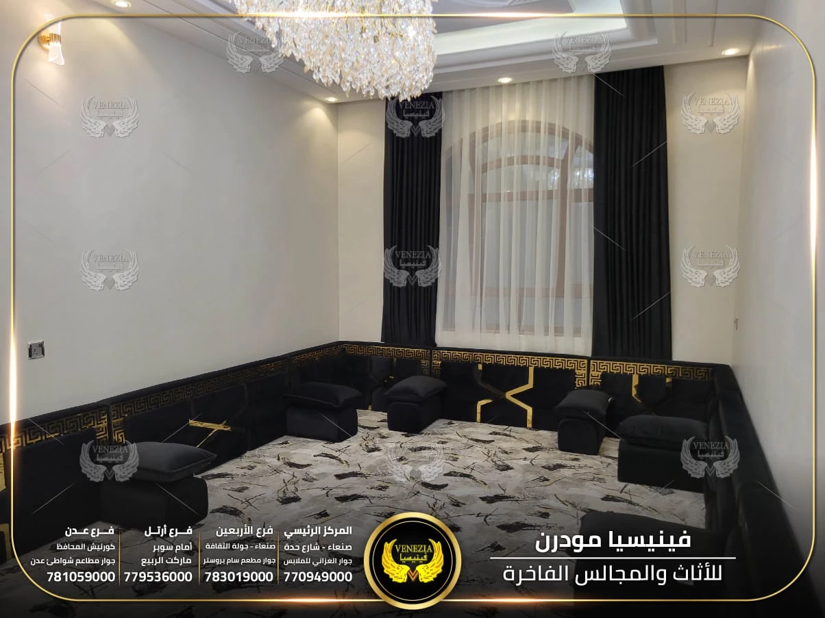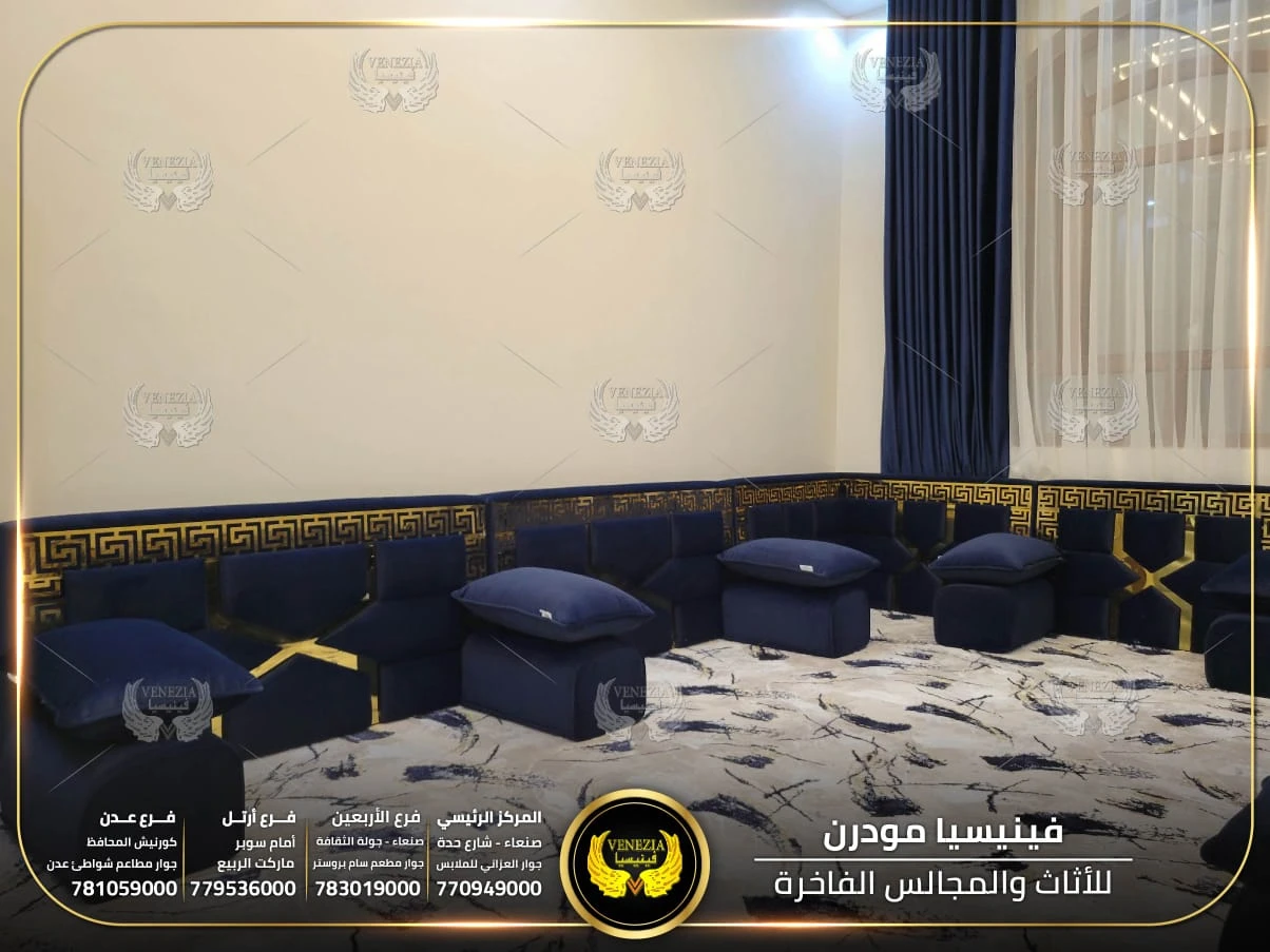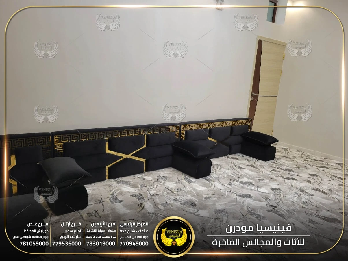 مجالس عربية من فينيسيا مودرن تجمع بين الفخامة والجودة العالية، مصنوعة من أفضل المواد وبأحدث التصاميم التي تناسب الذوق اليمني. نوفر مجالس جاهزة ومجالس تفصيل حسب الطلب مع إمكانية اختيار الألوان والأقمشة. نوفر شحنًا سريعًا داخل اليمن وخدمة تركيب احترافية.