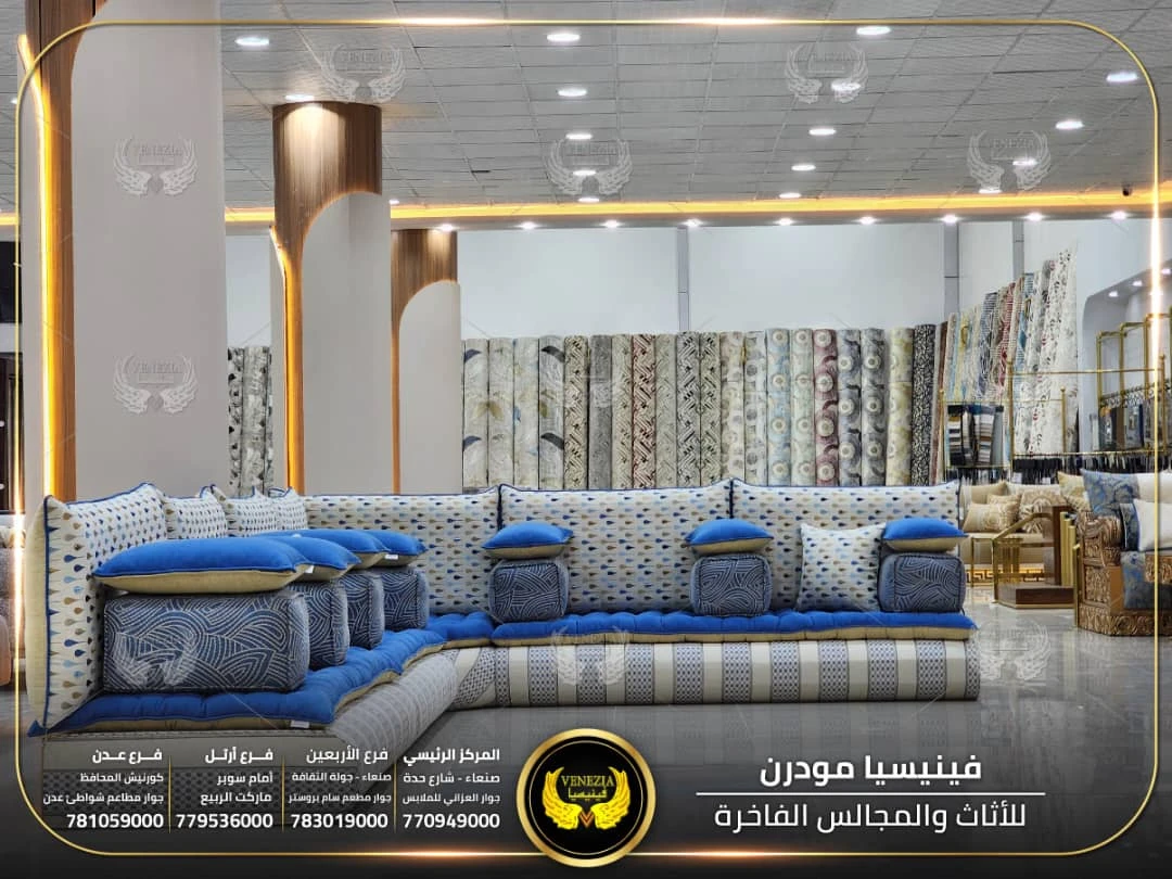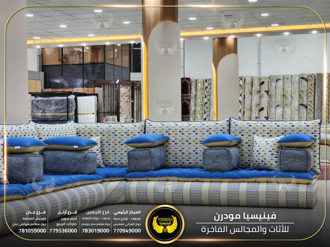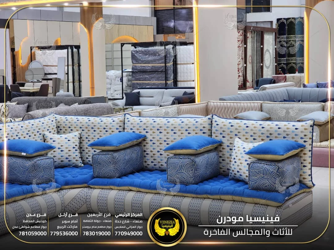 مجالس عربية من فينيسيا مودرن تجمع بين الفخامة والجودة العالية، مصنوعة من أفضل المواد وبأحدث التصاميم التي تناسب الذوق اليمني. نوفر مجالس جاهزة ومجالس تفصيل حسب الطلب مع إمكانية اختيار الألوان والأقمشة. نوفر شحنًا سريعًا داخل اليمن وخدمة تركيب احترافية.