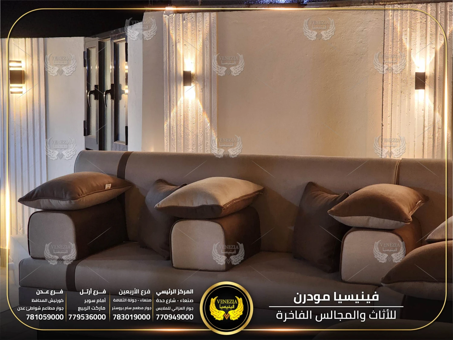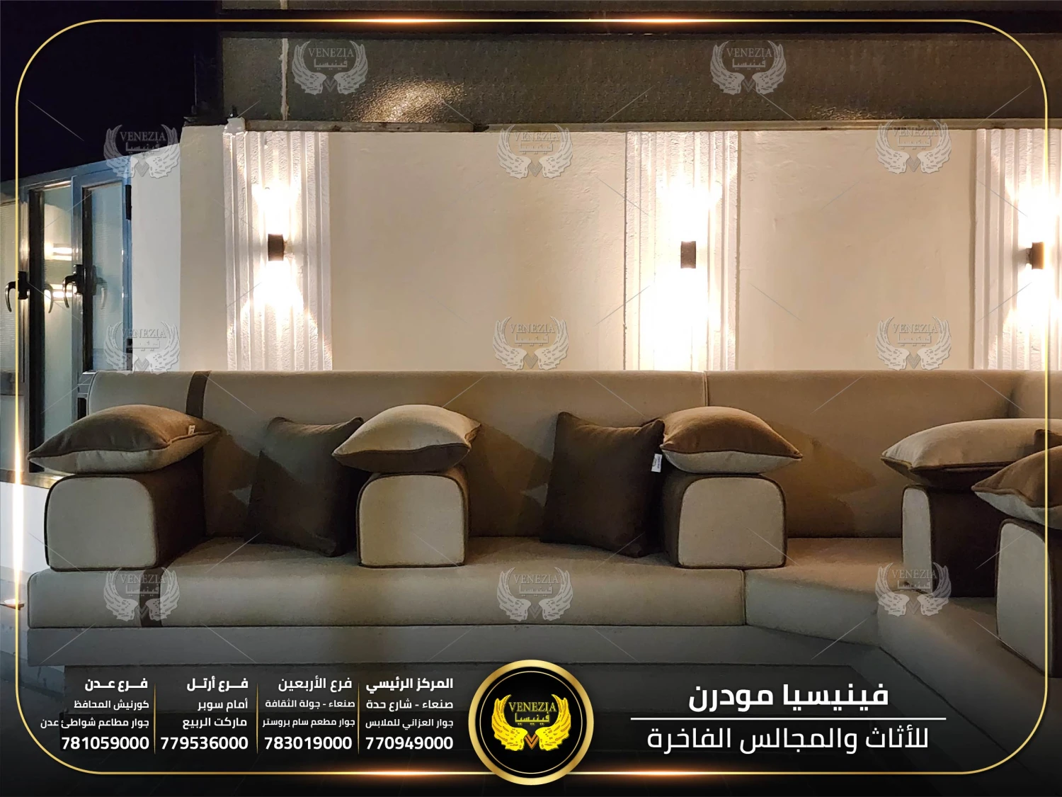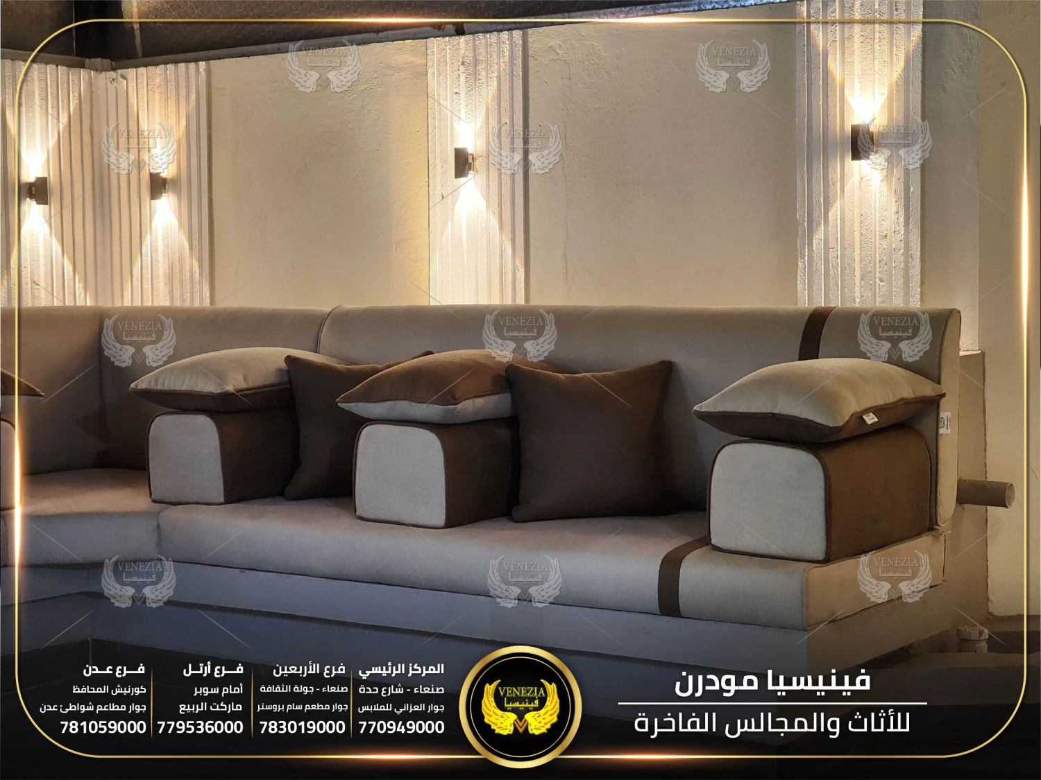 مجالس عربية من فينيسيا مودرن تجمع بين الفخامة والجودة العالية، مصنوعة من أفضل المواد وبأحدث التصاميم التي تناسب الذوق اليمني. نوفر مجالس جاهزة ومجالس تفصيل حسب الطلب مع إمكانية اختيار الألوان والأقمشة. نوفر شحنًا سريعًا داخل اليمن وخدمة تركيب احترافية.
