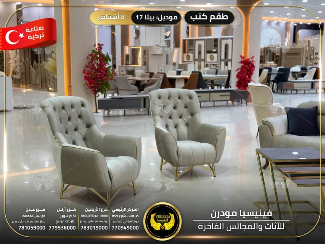 أضف لمسة فاخرة لمجلسك أو غرفة جلوسك مع الكنب التركي الفاخر المعروف بتصميمه الأنيق وجودته العالية. يجمع هذا الكنب بين الراحة والمتانة، ليمنح منزلك أسلوبًا راقيًا يتناسب مع ذوق العائلات في صنعاء وعدن وتعز والحديدة وإب وجميع محافظات اليمن.
