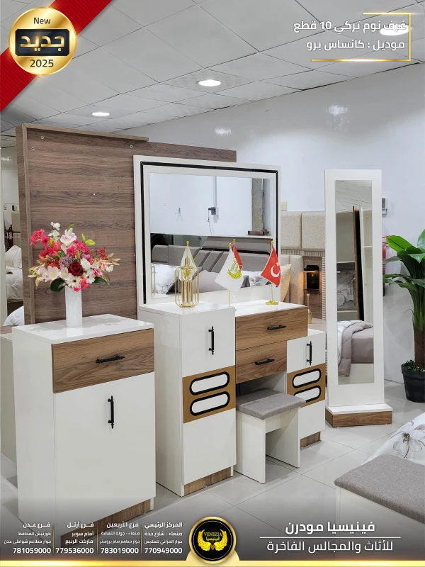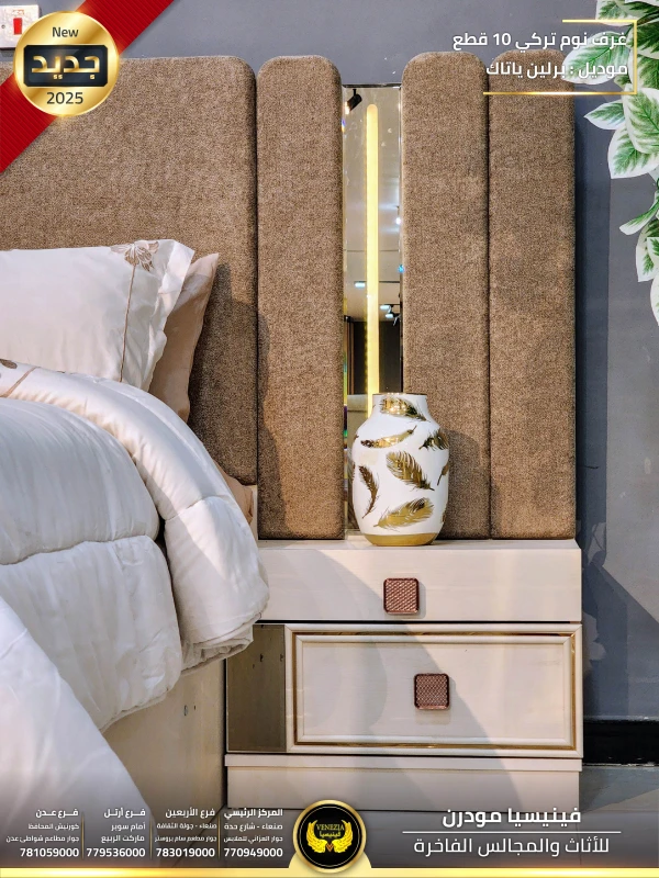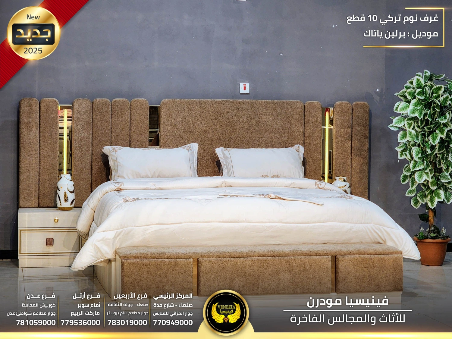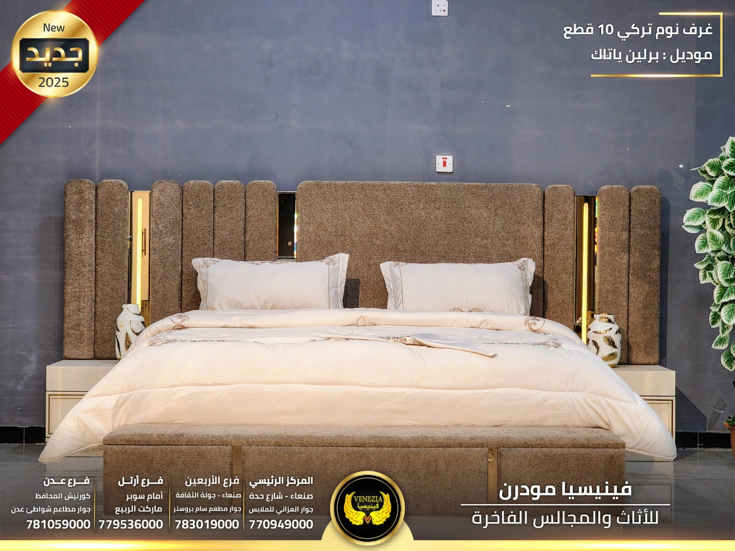 غرفة نوم فاخرة 10 قطع صناعة تركية بتصميم عصري يضيف لمنزلك لمسة راقية تجمع بين الجودة العالية والمتانة والأناقة. تأتي هذه الغرفة بخامات ممتازة مقاومة للاستخدام اليومي، وتناسب أجواء المنازل في اليمن بمختلف المحافظات مثل صنعاء، عدن، تعز، إب، الحديدة، المكلا، مأرب وغيرها.