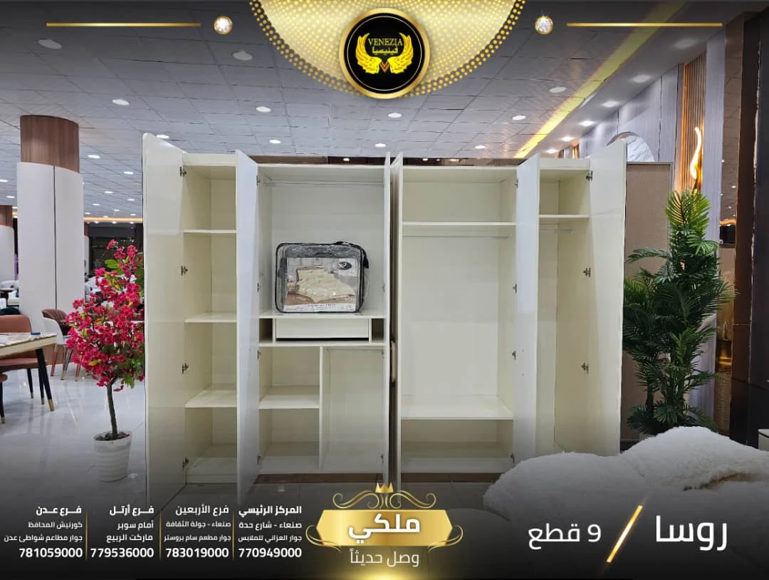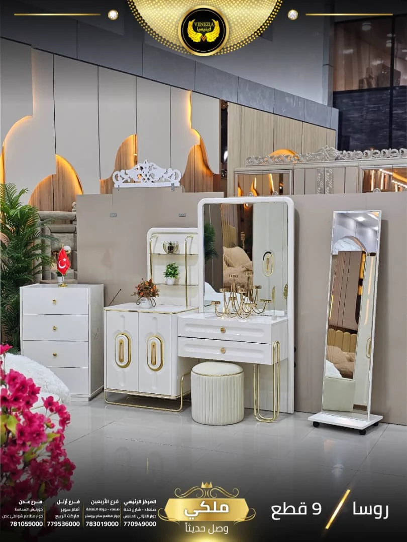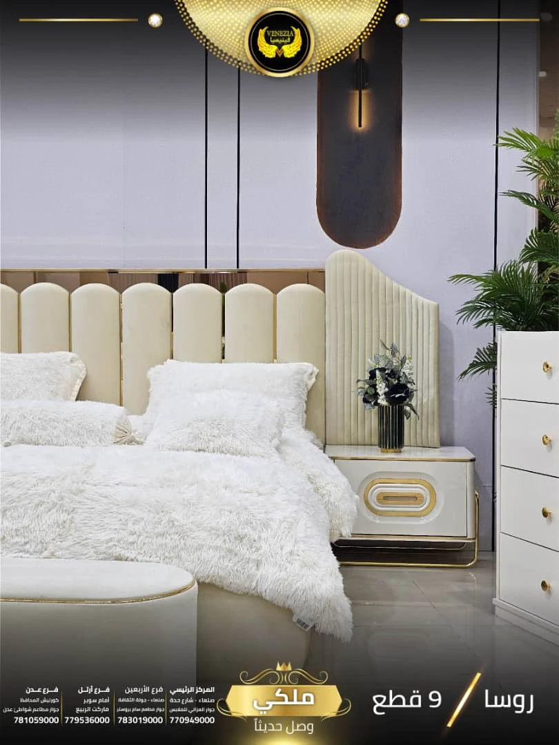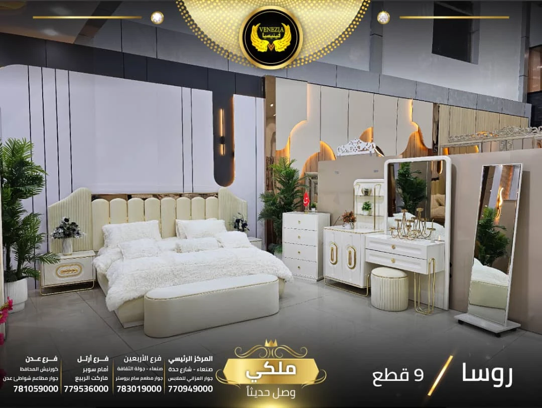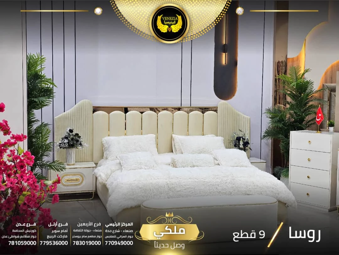 امنح غرفتك لمسة فخامة راقية مع غرفة نوم تركي 9 قطع – موديل روسا من شركة فينيسيا مودرن.