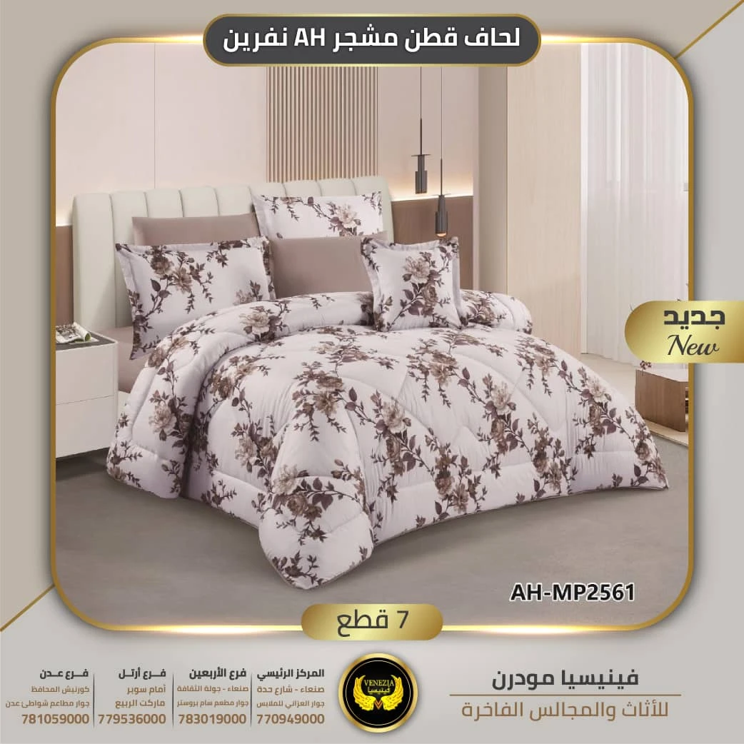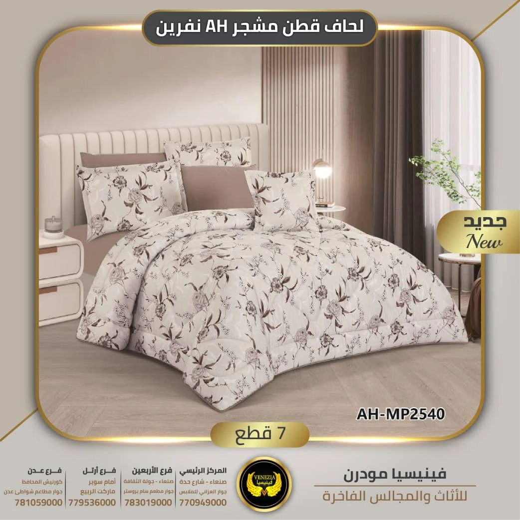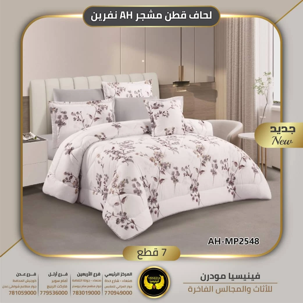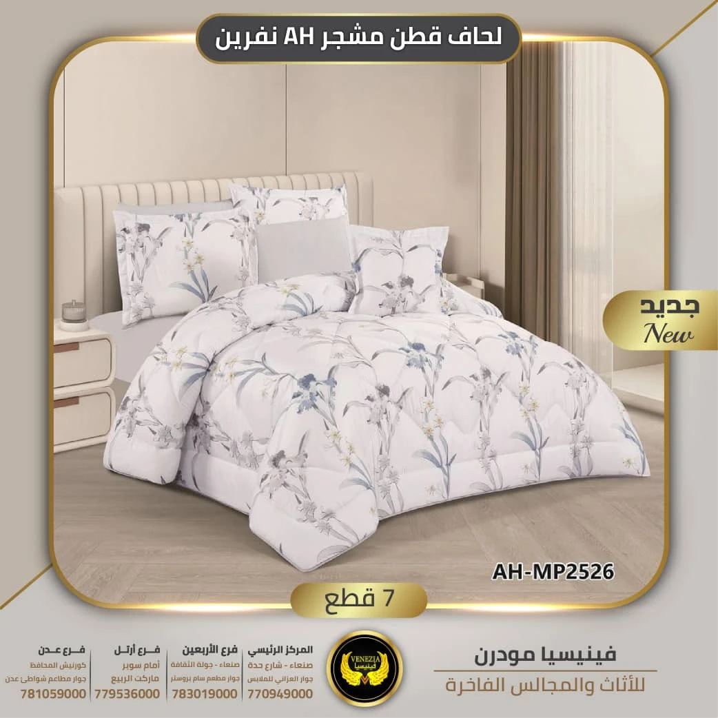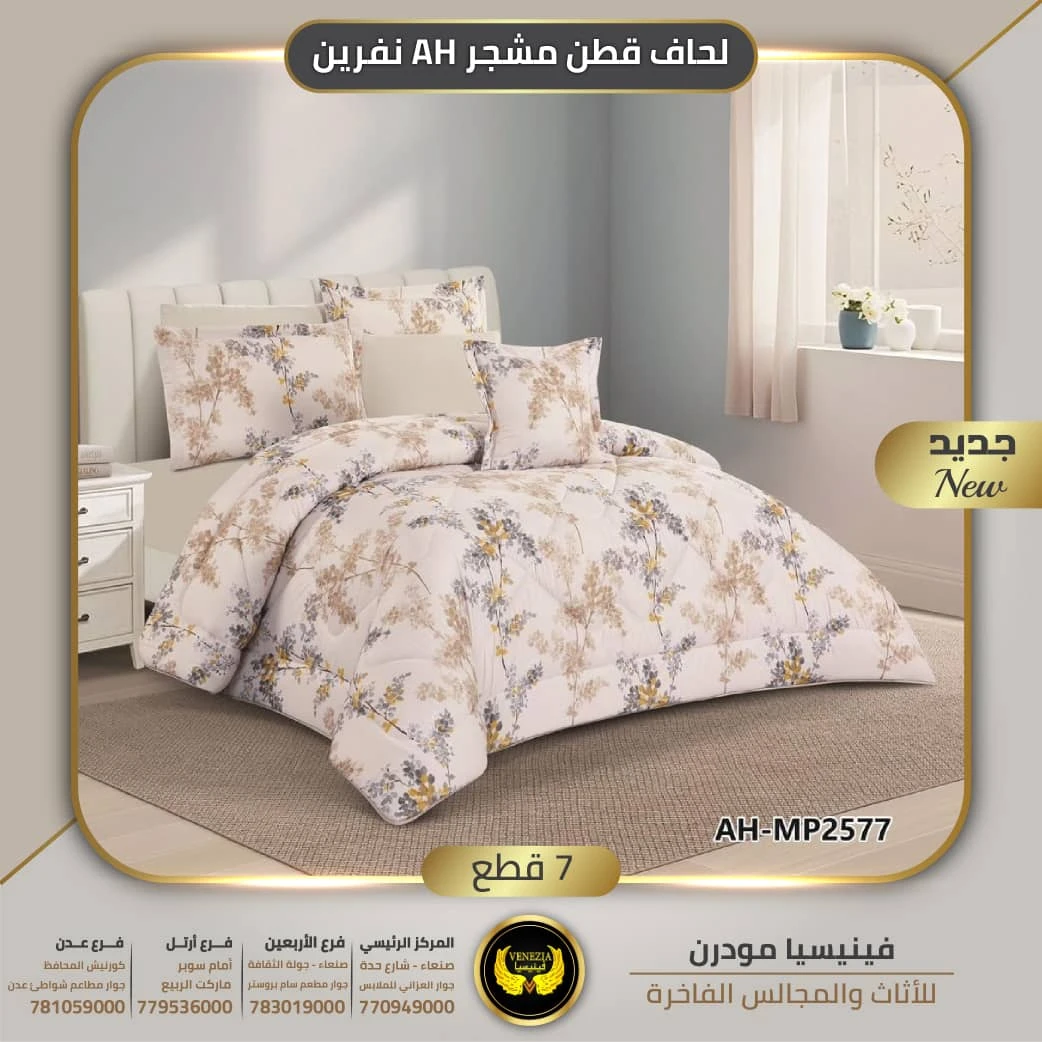 أضيفي جمالًا وأناقة لغرفة نومك مع لحافات قطن مشجر AH – طقم 7 قطع المتوفرة لدى فينيسيا مودرن.