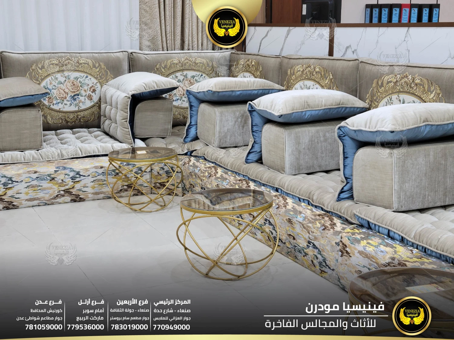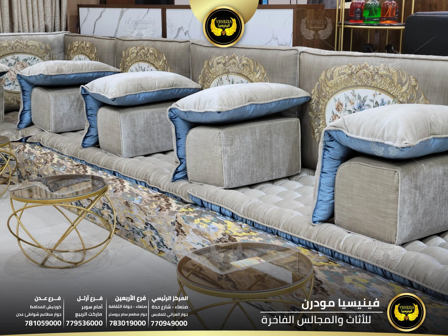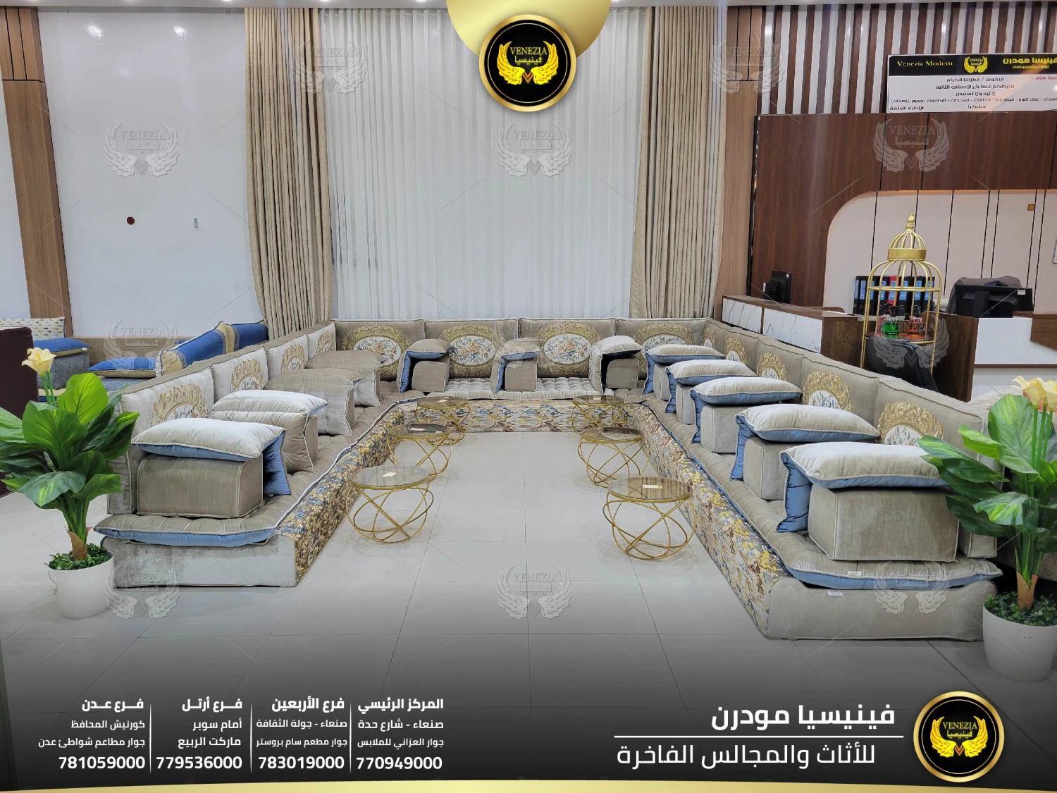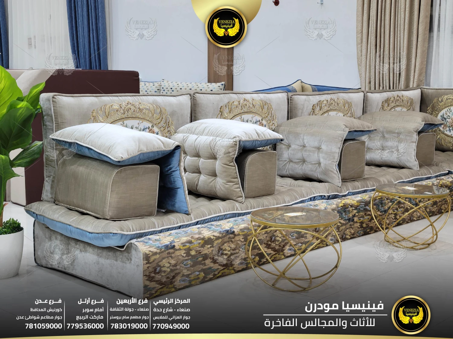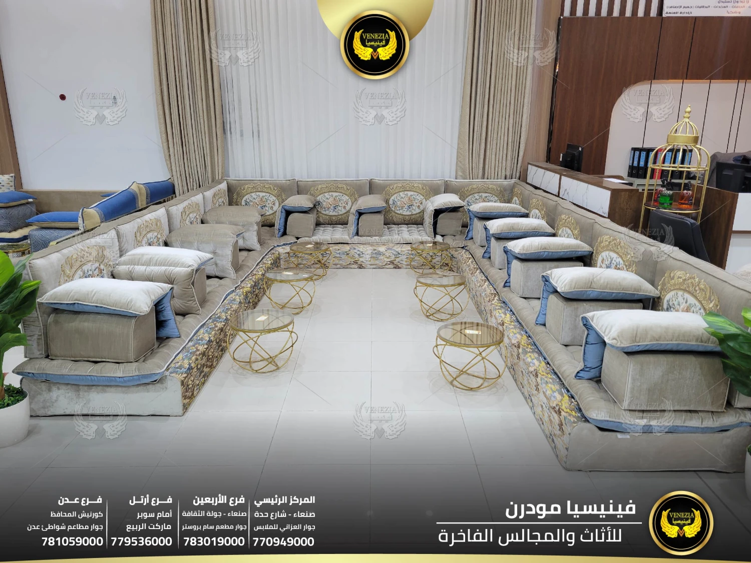 أفضل مجلس عربي فاخر في اليمن بتصميم ملكي وجودة عالية من فينيسيا مودرن. مجالس فخمة بصنعاء مع توصيل سريع لكل المحافظات. احجز الآن قبل نفاذ الكمية.