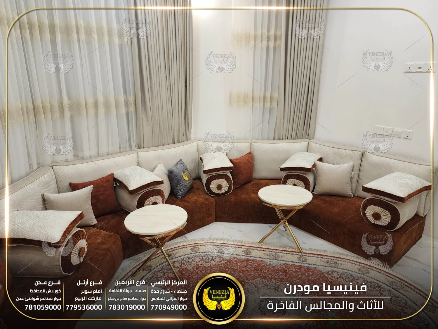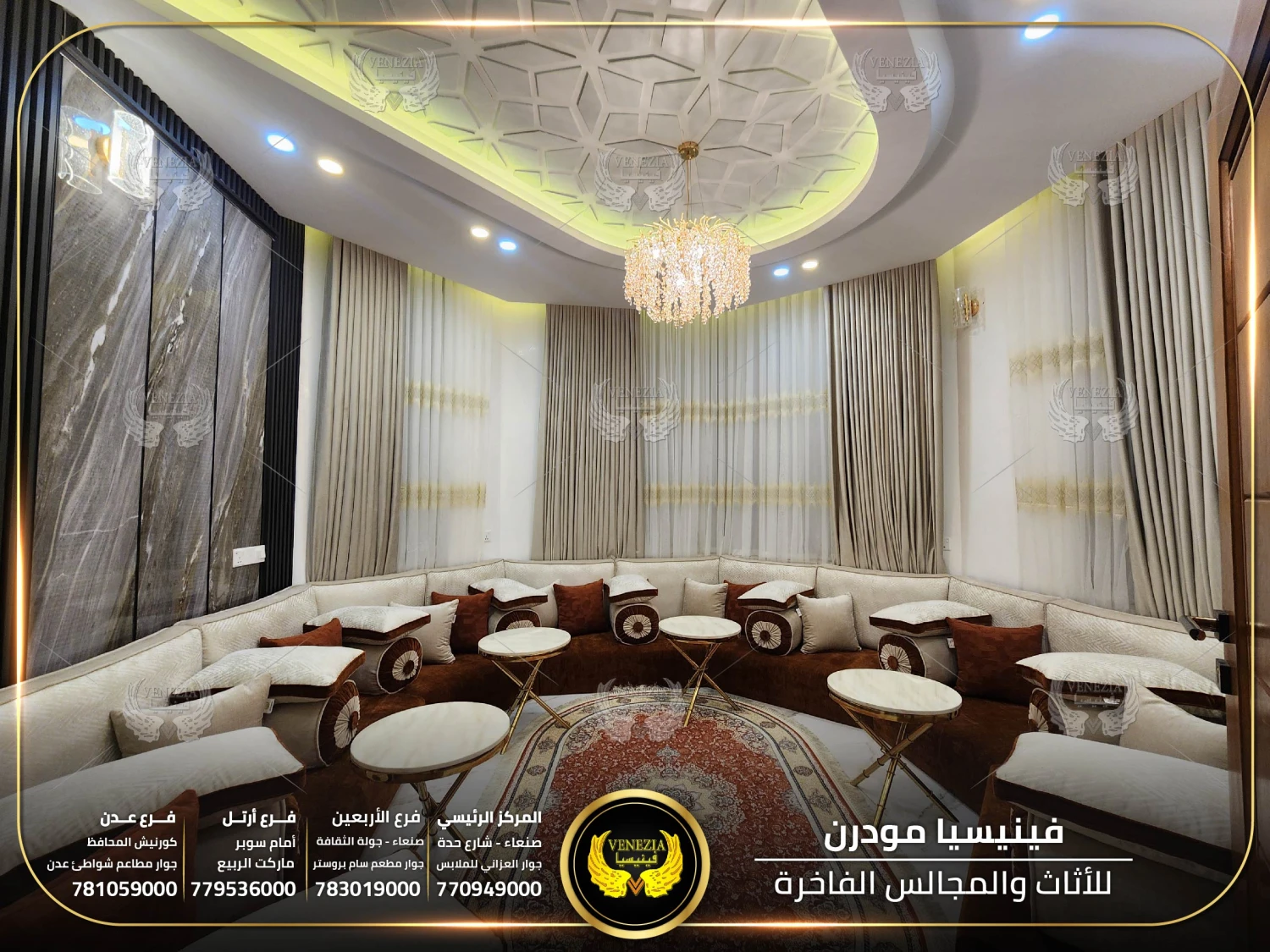 مجالس عربية من فينيسيا مودرن تجمع بين الفخامة والجودة العالية، مصنوعة من أفضل المواد وبأحدث التصاميم التي تناسب الذوق اليمني. نوفر مجالس جاهزة ومجالس تفصيل حسب الطلب مع إمكانية اختيار الألوان والأقمشة. نوفر شحنًا سريعًا داخل اليمن وخدمة تركيب احترافية.