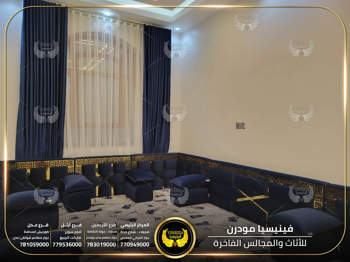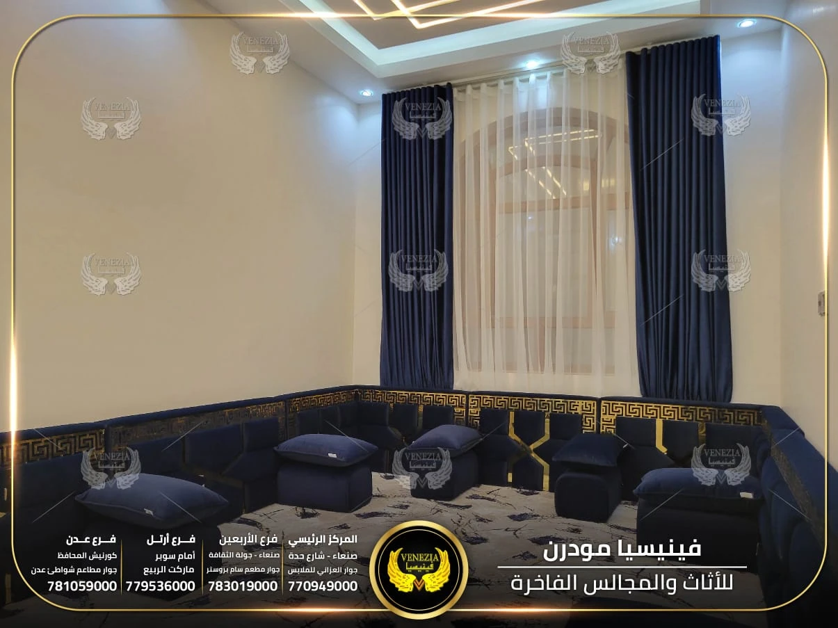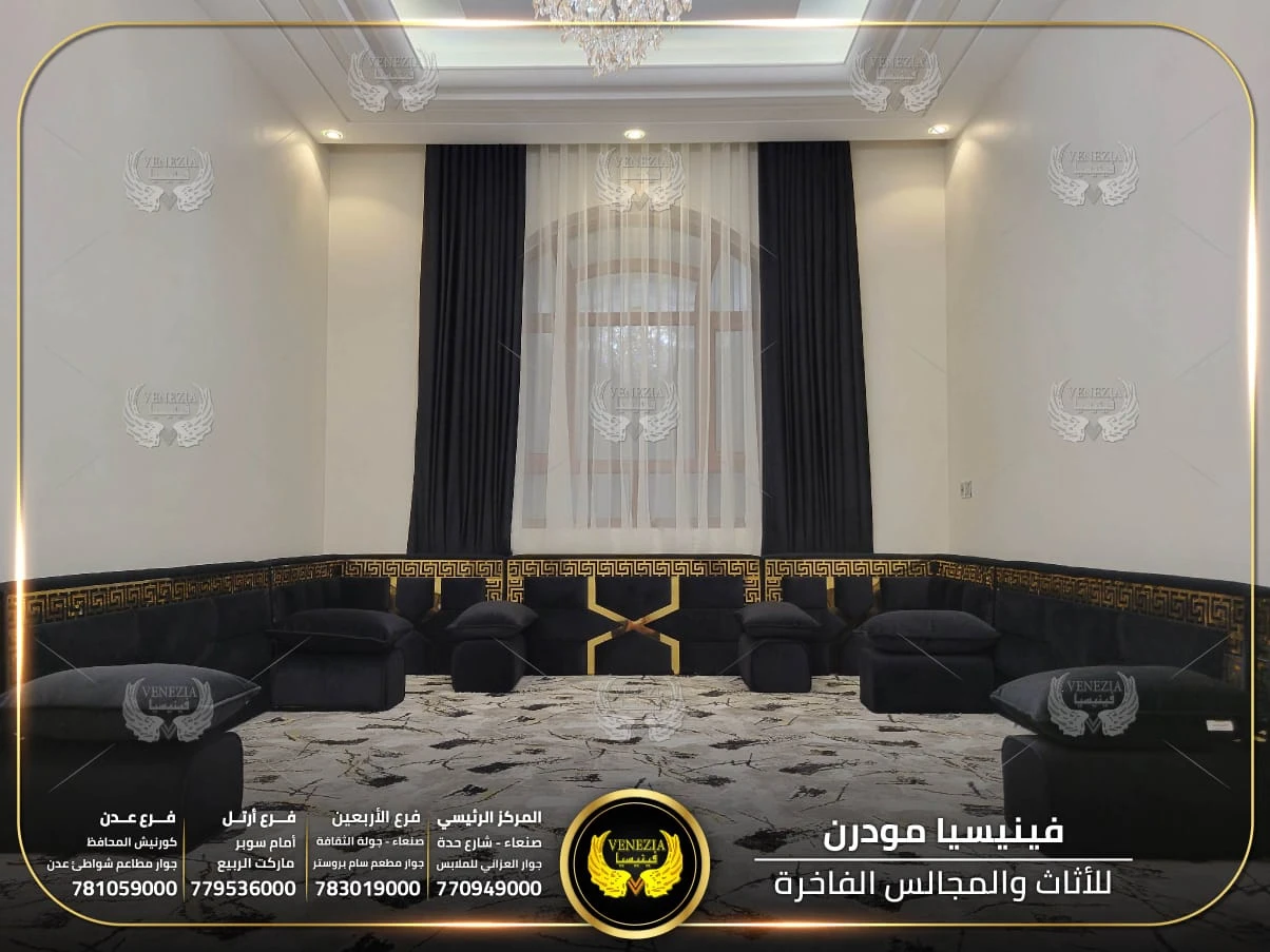 مجالس عربية من فينيسيا مودرن تجمع بين الفخامة والجودة العالية، مصنوعة من أفضل المواد وبأحدث التصاميم التي تناسب الذوق اليمني. نوفر مجالس جاهزة ومجالس تفصيل حسب الطلب مع إمكانية اختيار الألوان والأقمشة. نوفر شحنًا سريعًا داخل اليمن وخدمة تركيب احترافية.