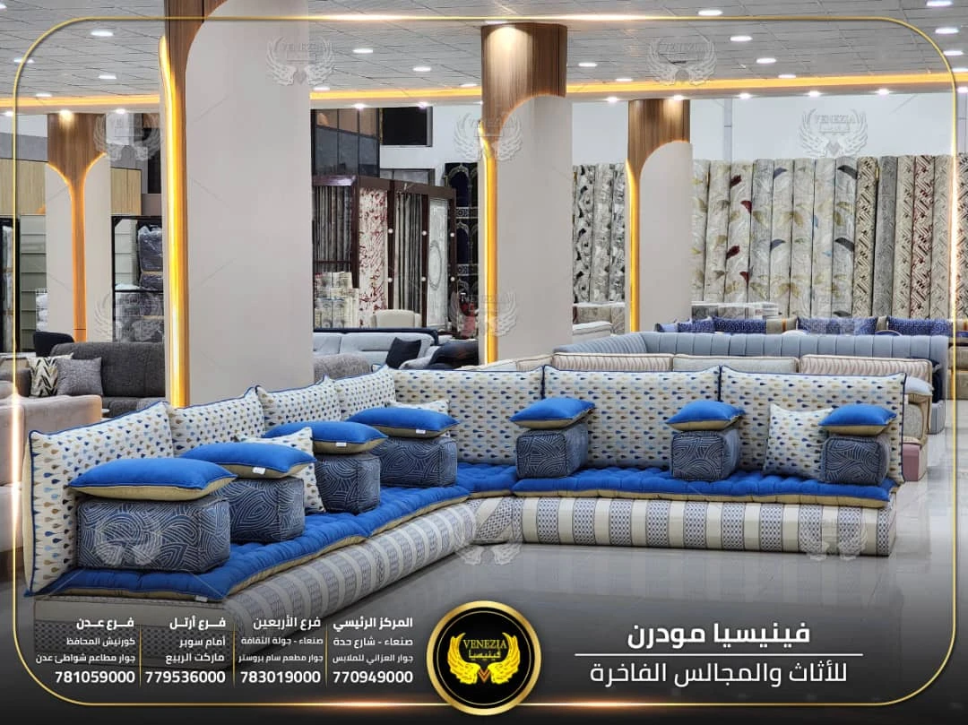 مجالس عربية من فينيسيا مودرن تجمع بين الفخامة والجودة العالية، مصنوعة من أفضل المواد وبأحدث التصاميم التي تناسب الذوق اليمني. نوفر مجالس جاهزة ومجالس تفصيل حسب الطلب مع إمكانية اختيار الألوان والأقمشة. نوفر شحنًا سريعًا داخل اليمن وخدمة تركيب احترافية.