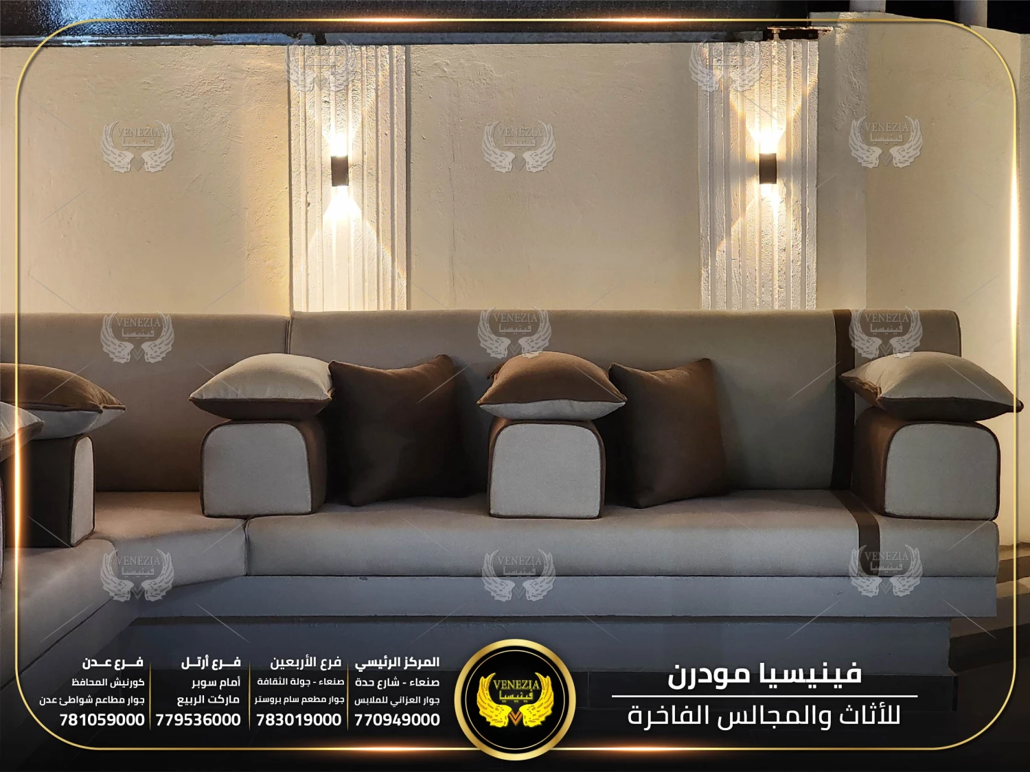 مجالس عربية من فينيسيا مودرن تجمع بين الفخامة والجودة العالية، مصنوعة من أفضل المواد وبأحدث التصاميم التي تناسب الذوق اليمني. نوفر مجالس جاهزة ومجالس تفصيل حسب الطلب مع إمكانية اختيار الألوان والأقمشة. نوفر شحنًا سريعًا داخل اليمن وخدمة تركيب احترافية.